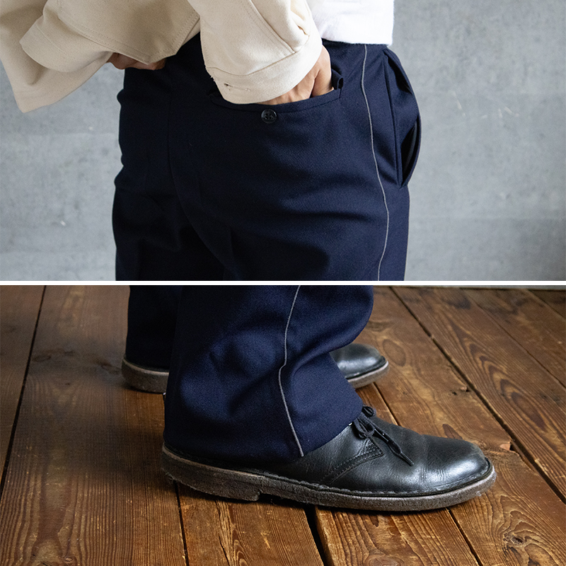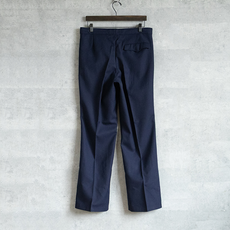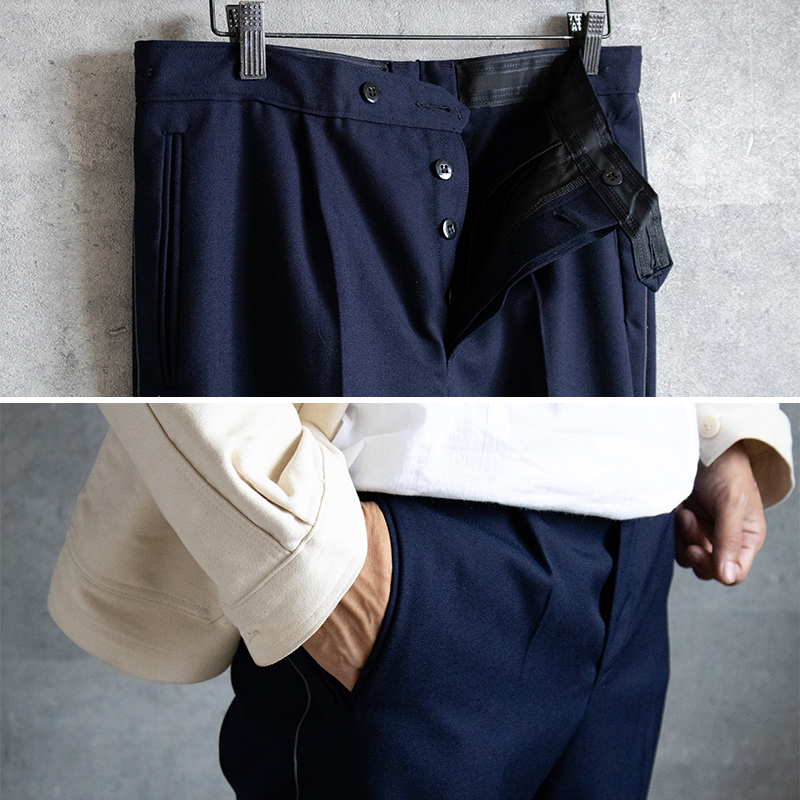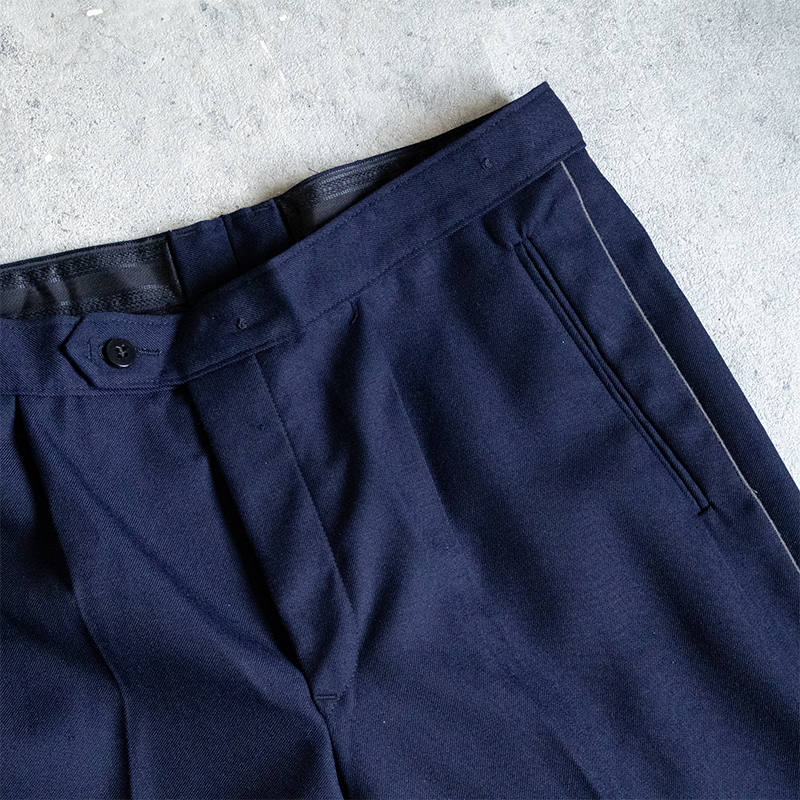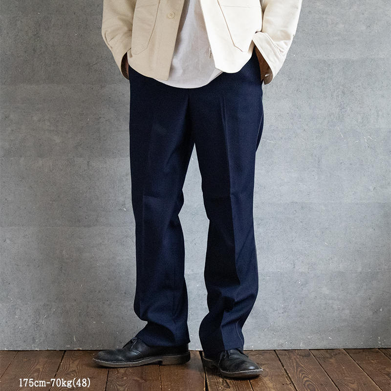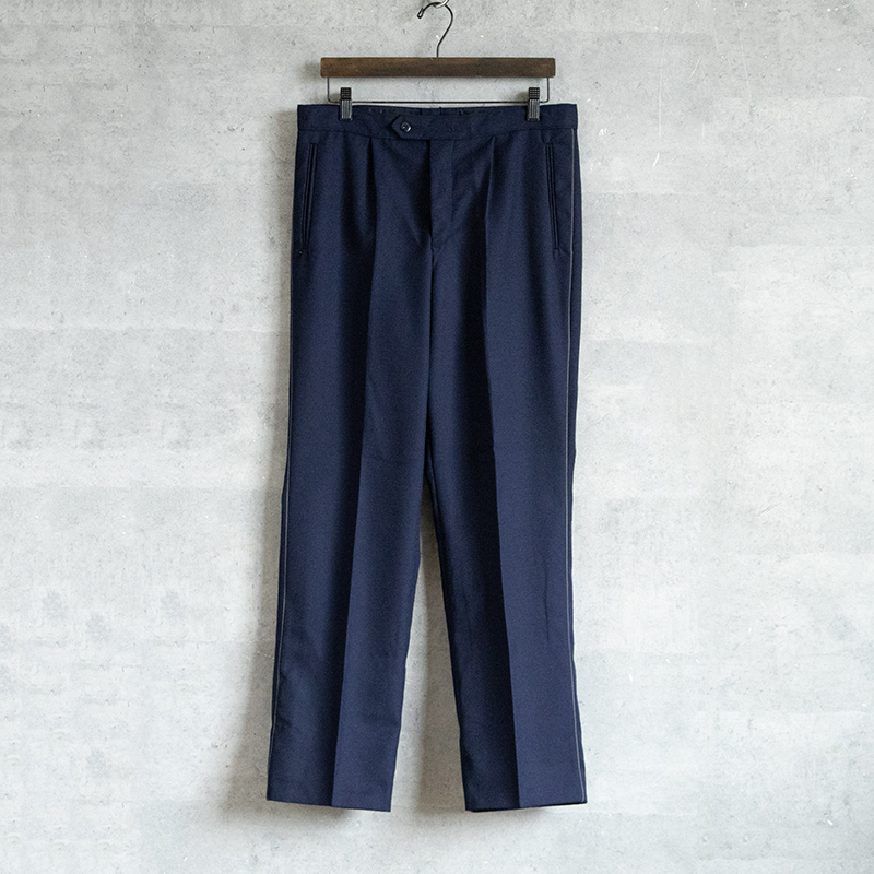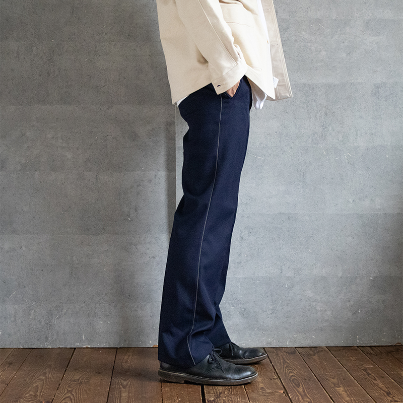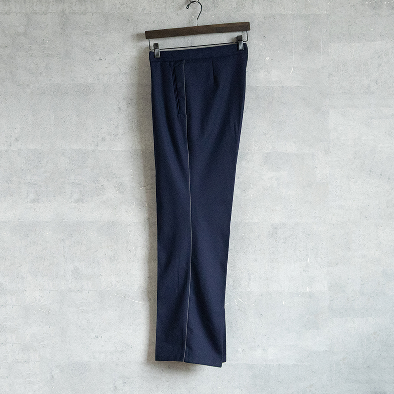 ワンタック入りのストレートシルエット。 ネイビーカラーで両サイドには細いグレーのパイピングライン入り。
