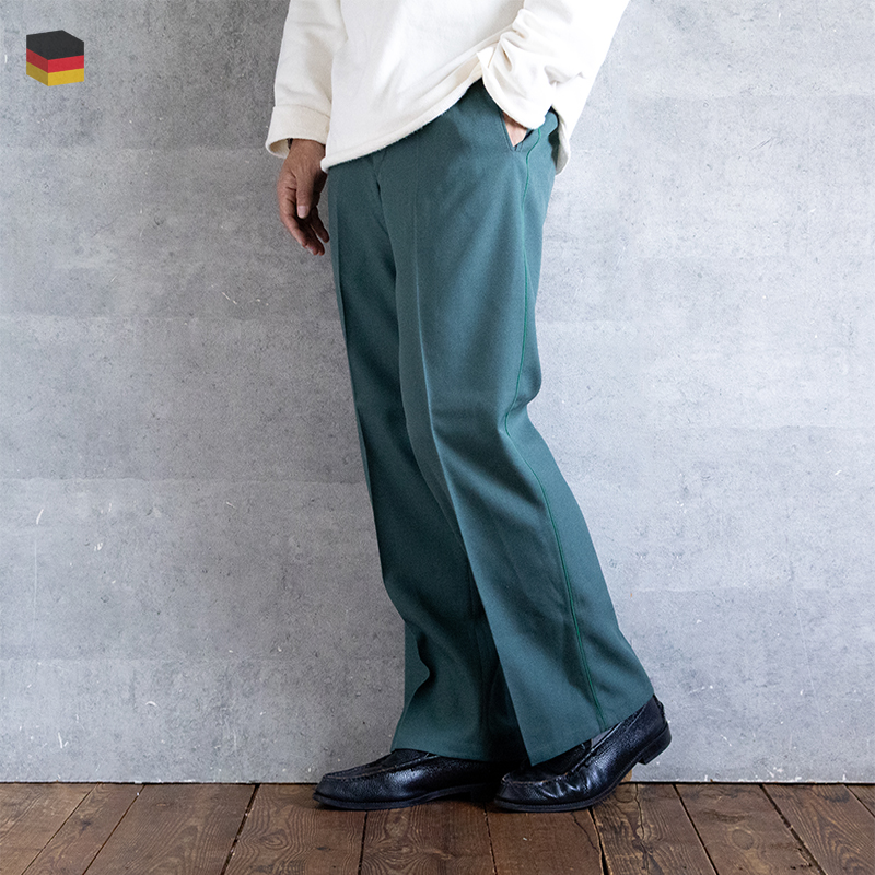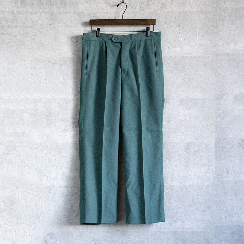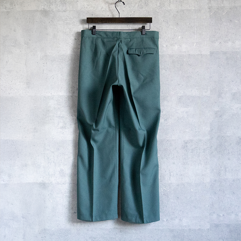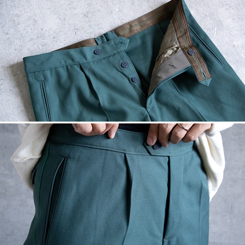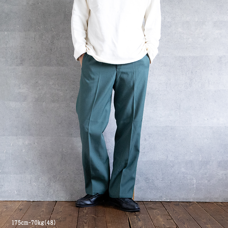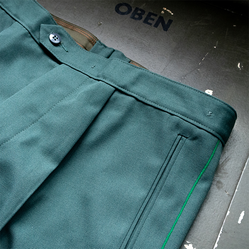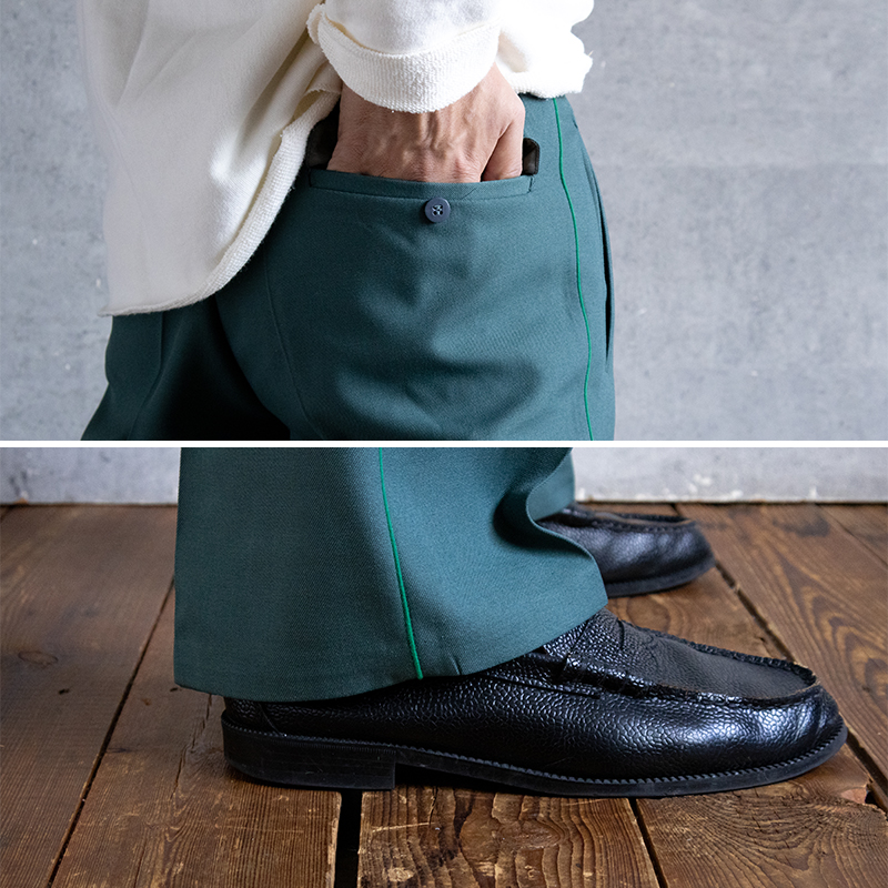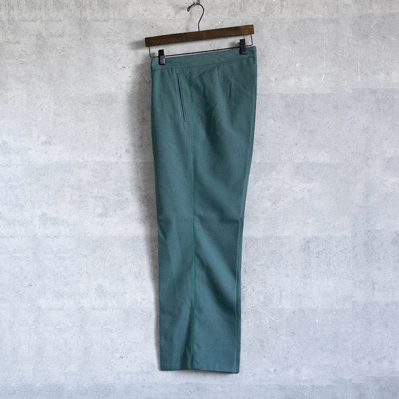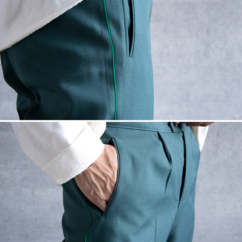 ワンタック入りのストレートシルエット。 両サイドには細いグリーンのパイピングライン入り。