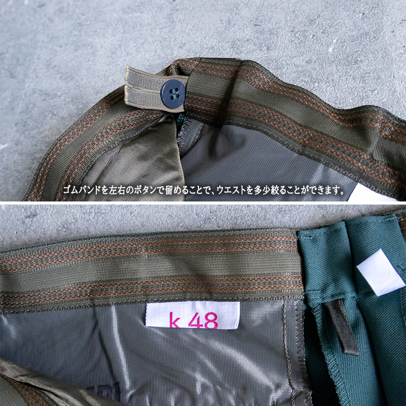 ウエスト後ろ側にはゴムバンドが通っており、内側の左右のボタンで留めて多少絞ることができます。