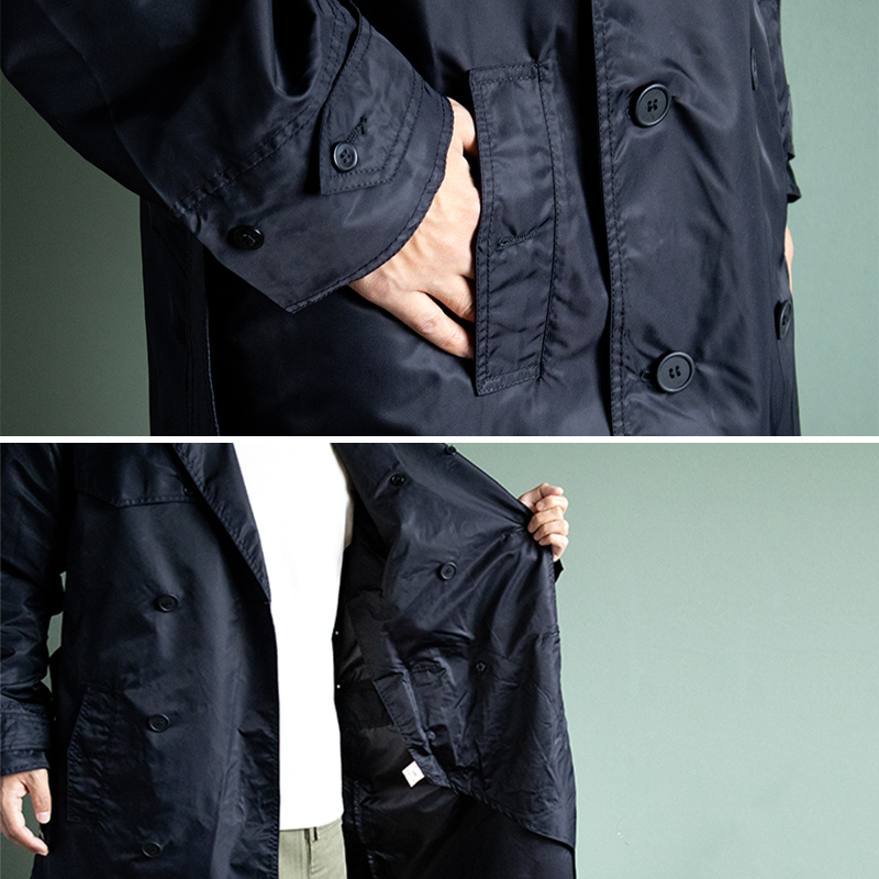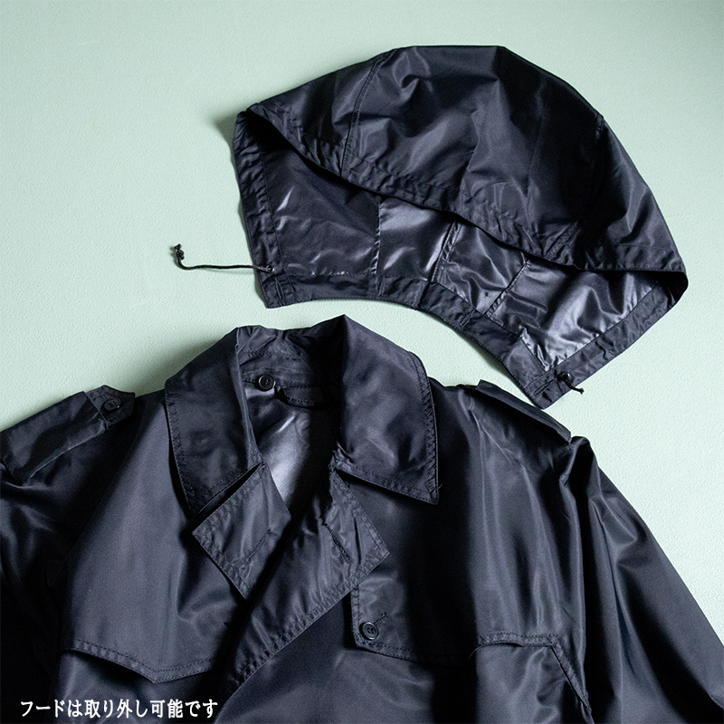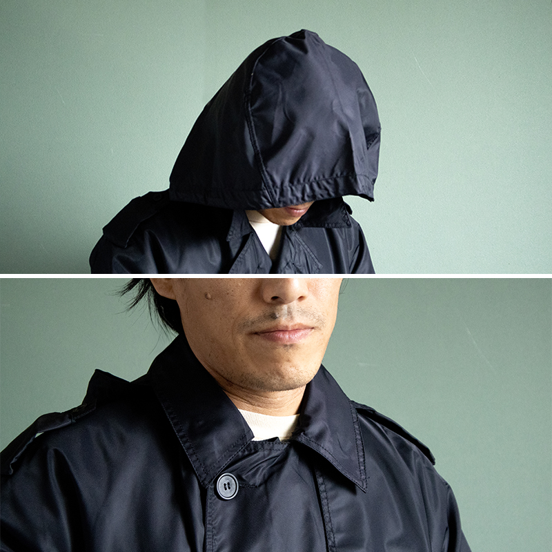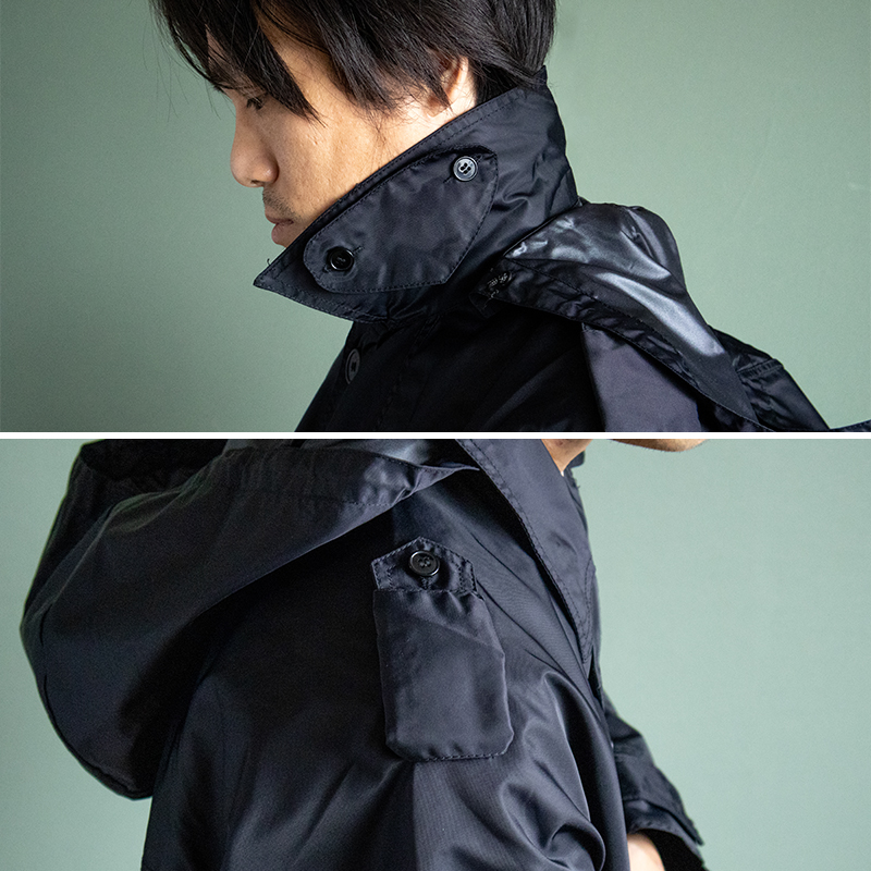 フード付きレインコートとして支給されるアイテムで生地は裏側が防水コーティングされたナイロンで、肩周りと前身頃は二重生地となっています。