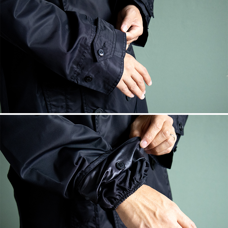 袖口の内側にはゴムで絞られた生地が付いており雨風の侵入を防ぎます。 ウエストベルトは取り外し可能です。