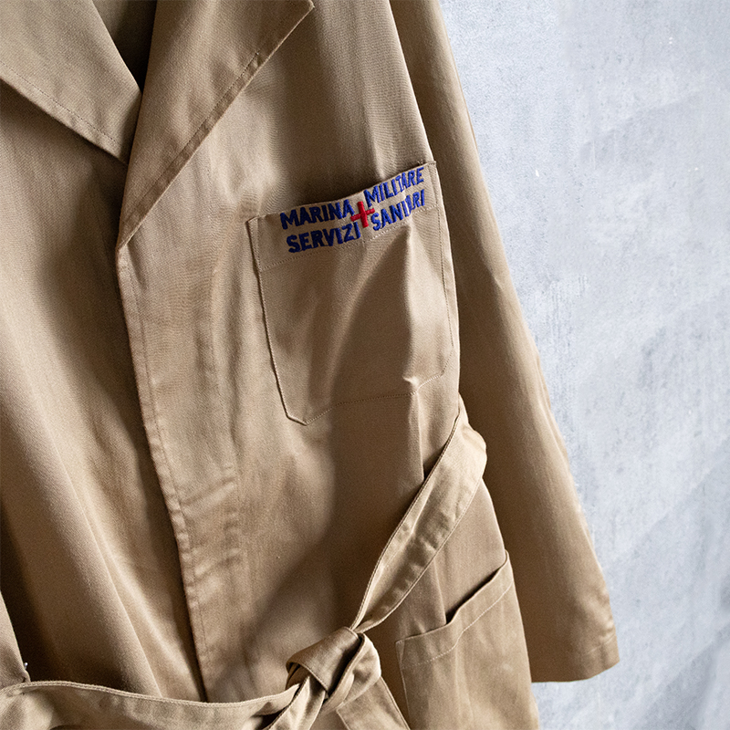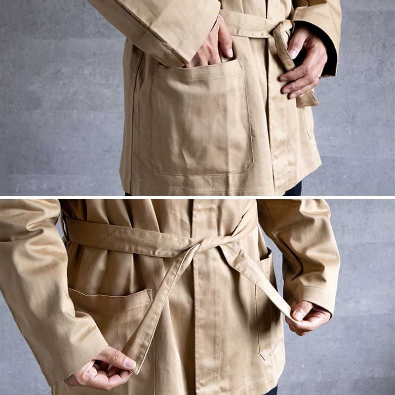 前合わせは開閉ボタン等は無く、ウエストベルトのみとなります。 裏地なしで生地はやや光沢感のあるコットン製。