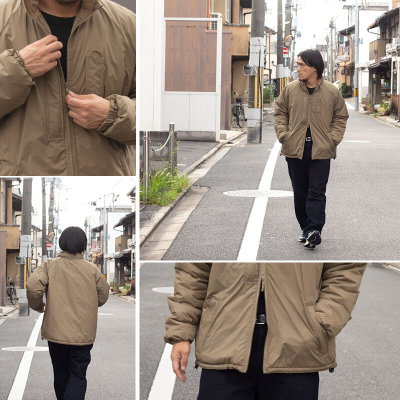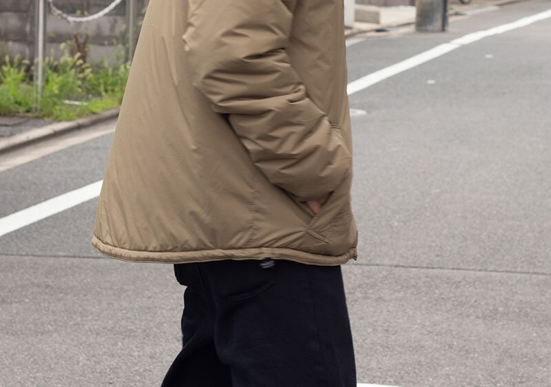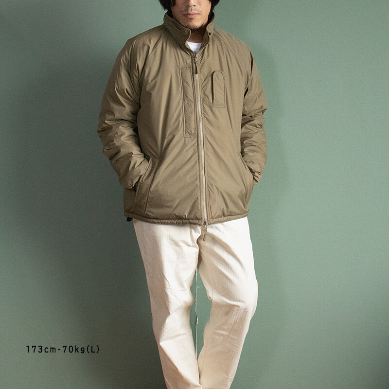 薄手のナイロン素材と保温性のある中綿が使われた軽量な防寒ジャケットです。 襟の内側は温かいフリース素材となっています。