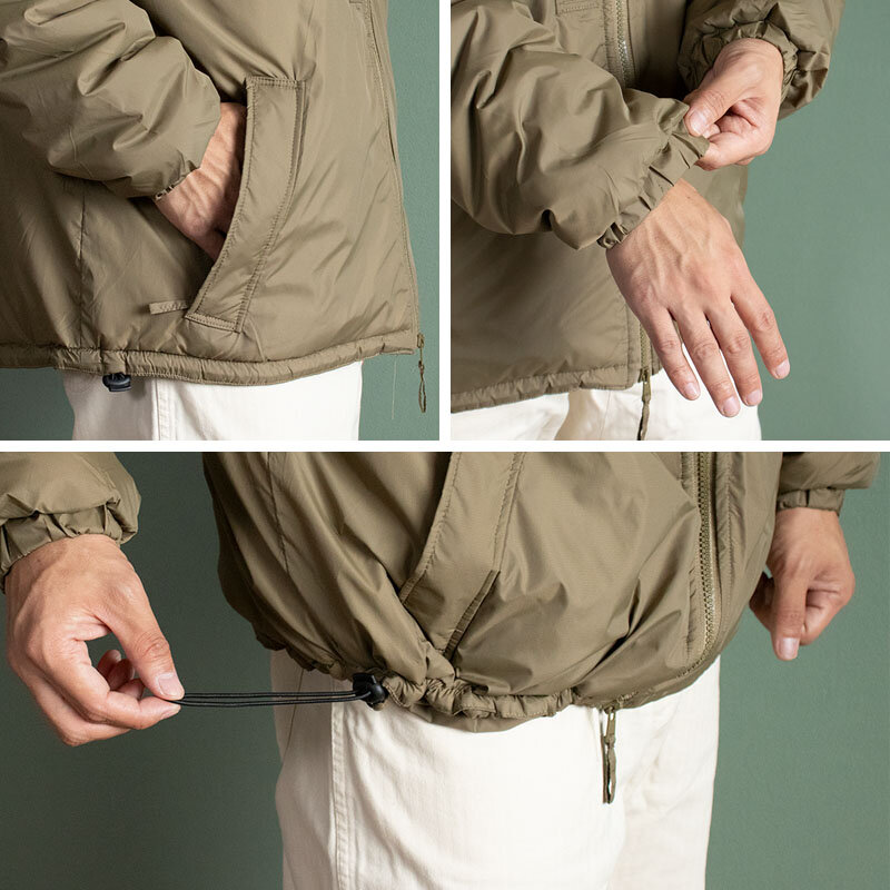 フロントはダブルジッパー開閉。 裾はドローコード入りでシルエットに変化をつけることができます。