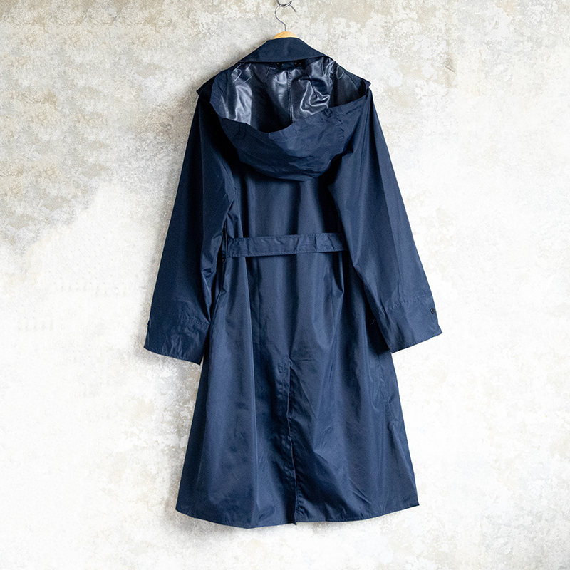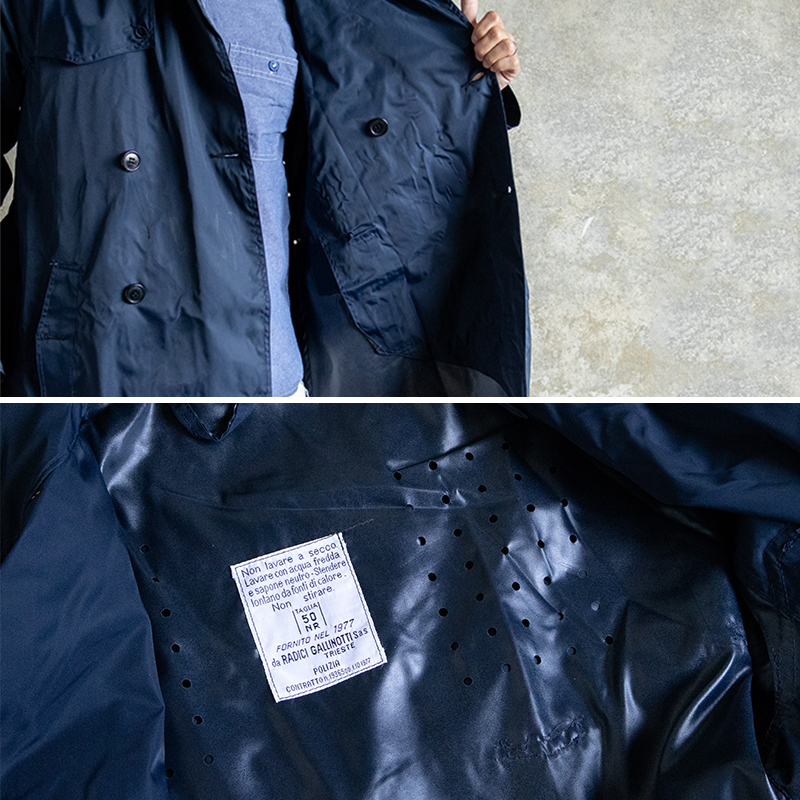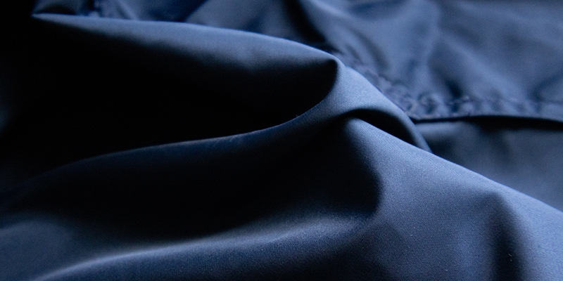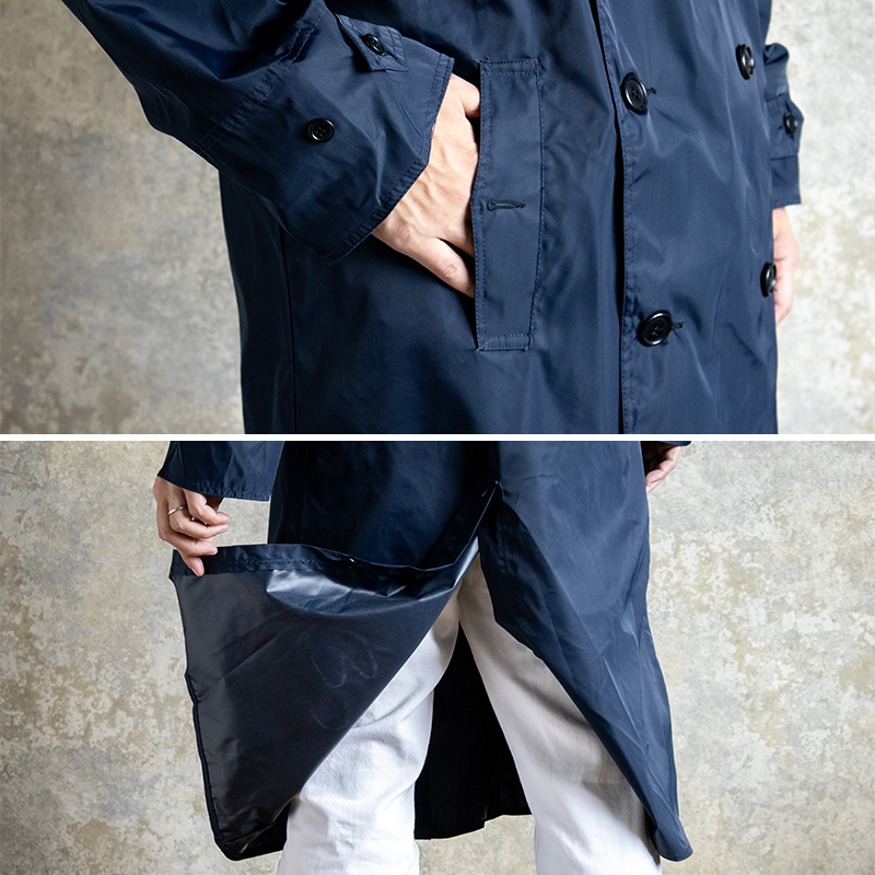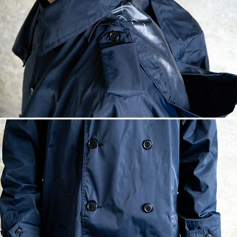 裏側が防水コーティングされたナイロンで、肩周りと前身頃は二重生地となっています。