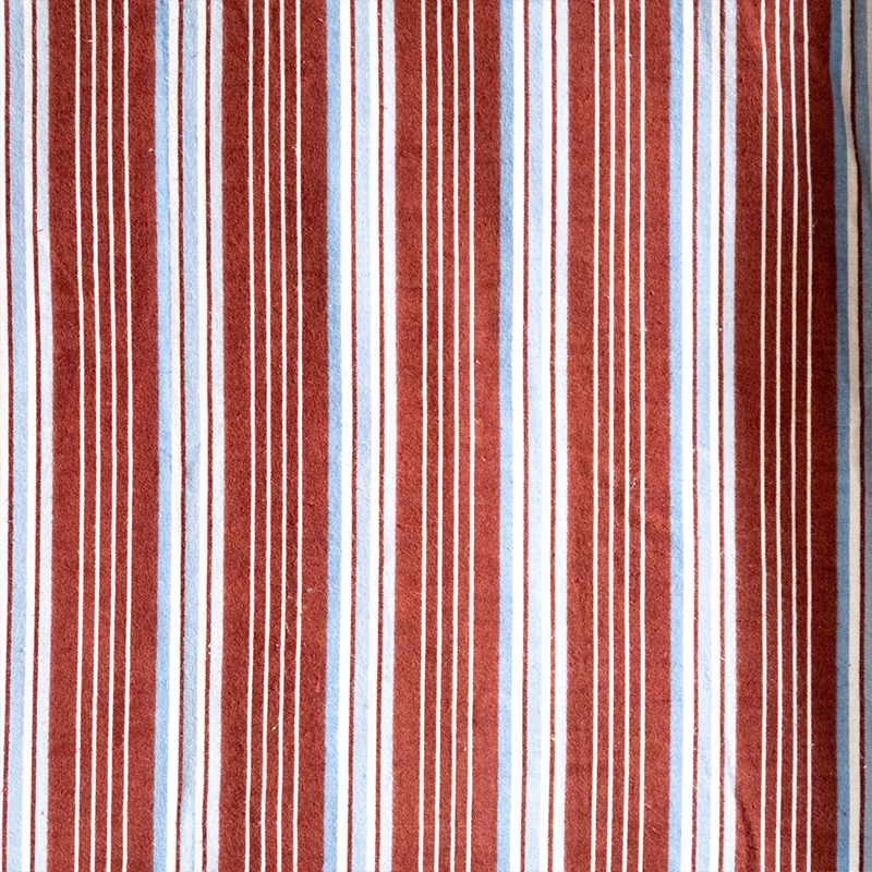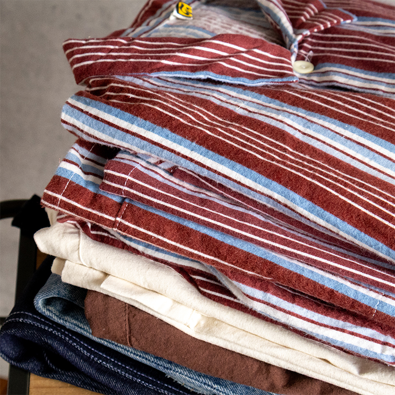 リラックス感あふれるシルエットで、赤味を帯びたブラウンと落ち着いた水色が使われているため、派手すぎず程よくカジュアル。