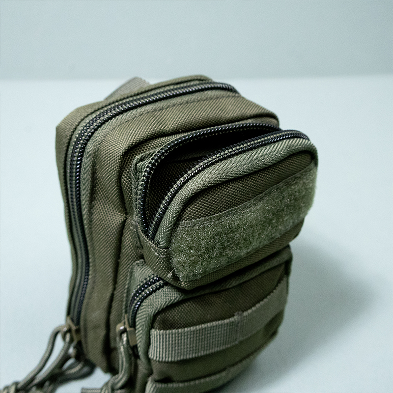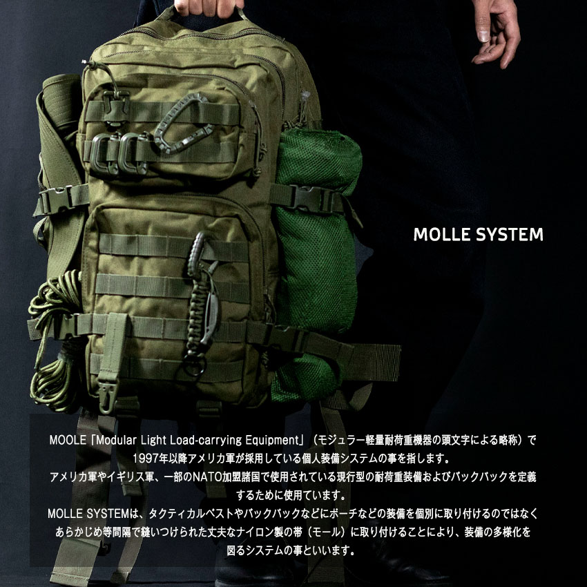 フロントには、MOLLE(モール)システムとベルクロ(マジックテープ)付きで、
