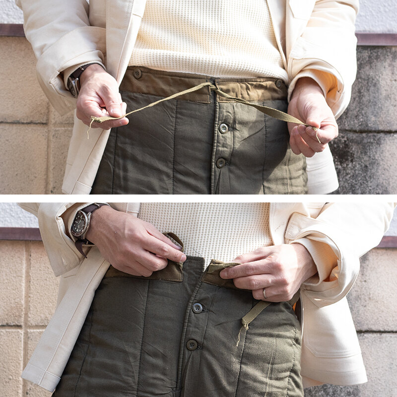 裾にリブが付いたテーパードシルエットです。フロントはボタンが2つ、ドローコードでウエスト調節が可能です。