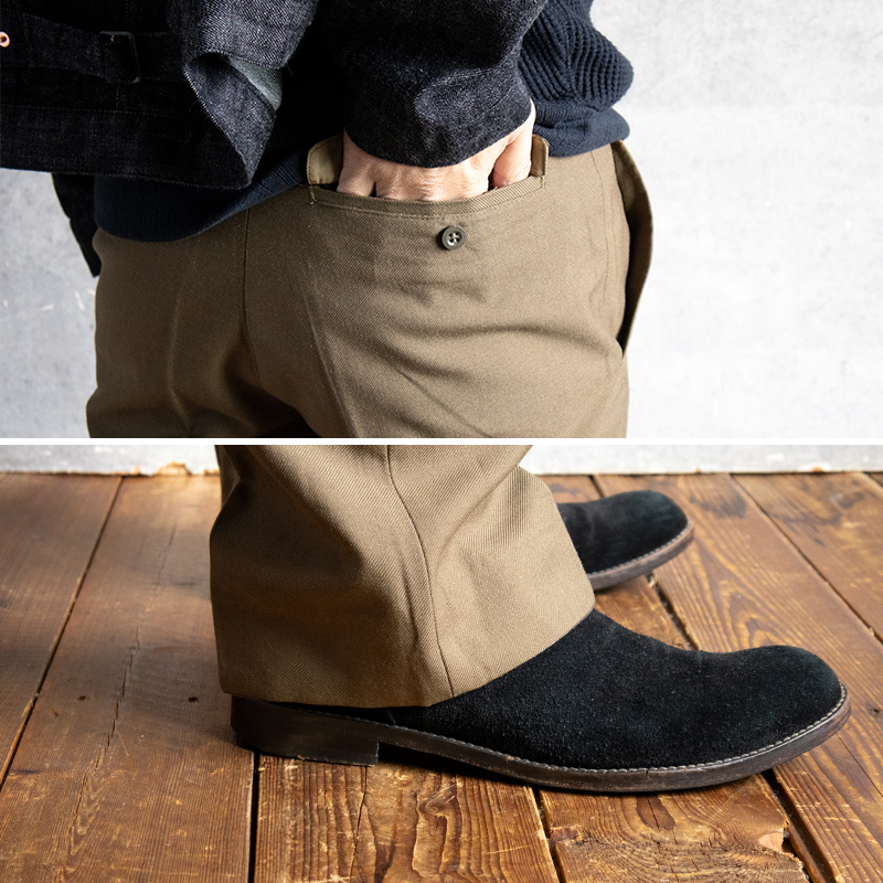ミリタリー特有の無骨な雰囲気を残しつつも、現代のファッションにも取り入れやすく上品なシルエットが魅力。