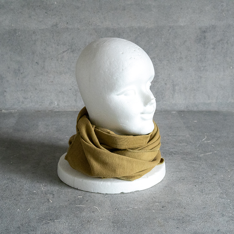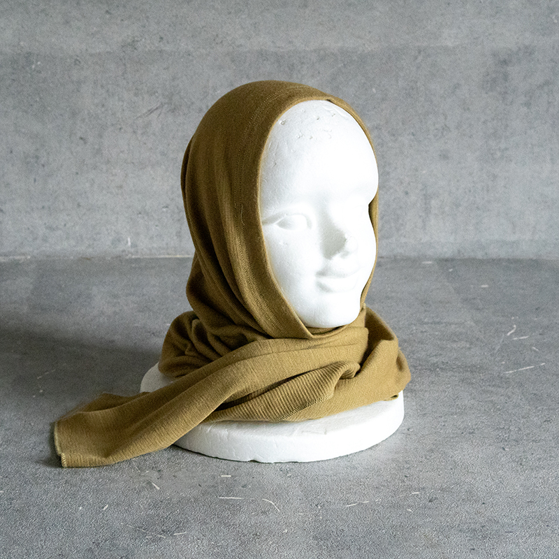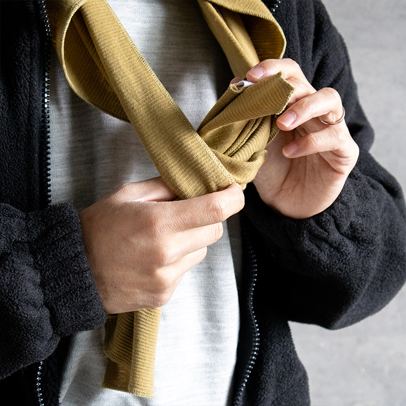 マフラーのように普通に首に巻いたり、被ってから二股部分を巻いたりそのまま下に垂らしたり使い方はいろいろあります。