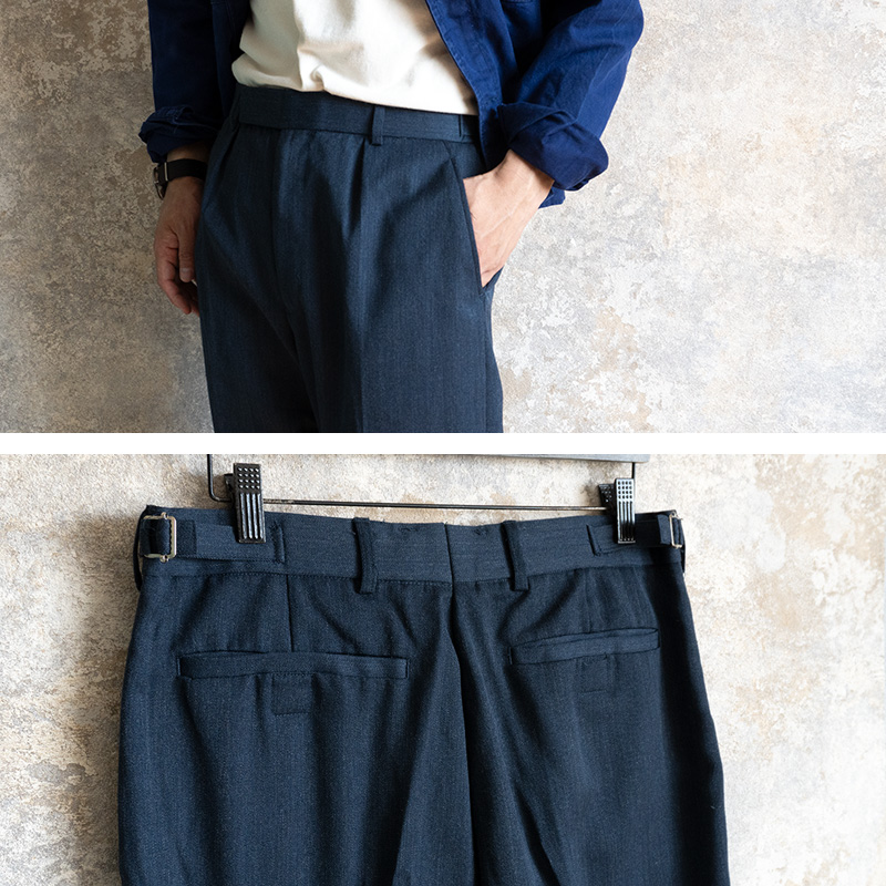 若干テーパードのかかったシルエットになっており、サイドアジャスターでウエストの調整も可能です。