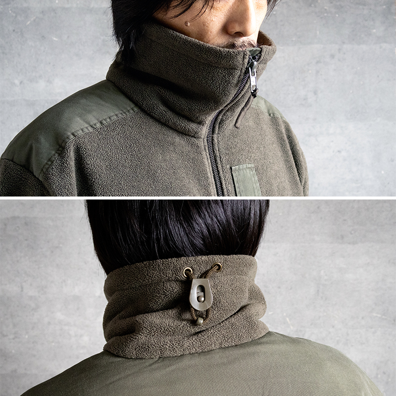 襟は首を覆うハイネック仕様で保温力があり、さらにドローコードで絞ることができ防風性にも優れています。