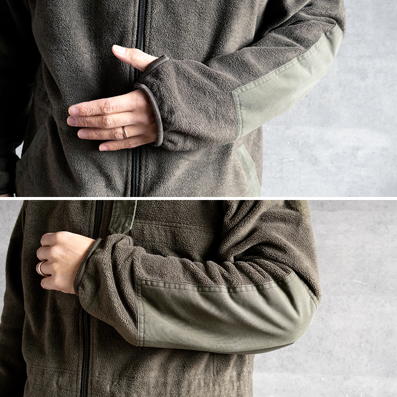 摩耗しやすい肩と肘はポリコットン素材のあて布で補強されています。右胸と両腕にはワッペン用マジックテープ付きです。