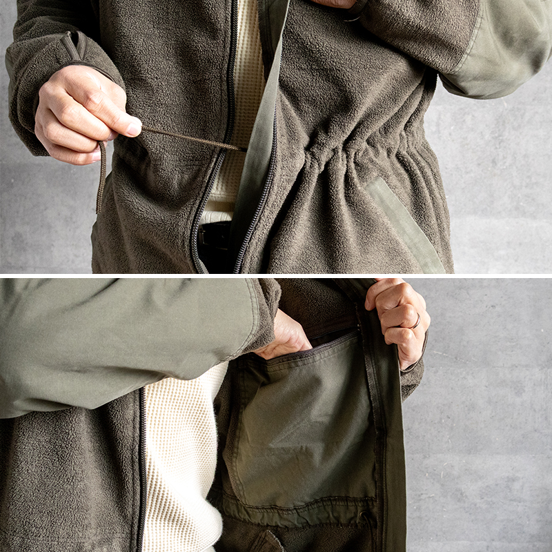 袖口には親指用のホールが空いています。ウエストは内側のドローコードで絞ることができます。