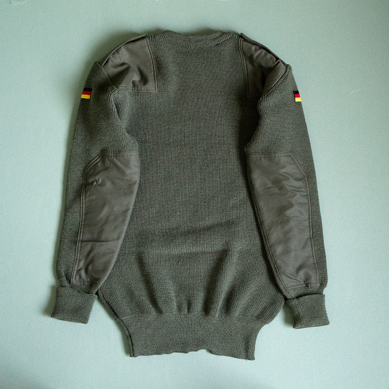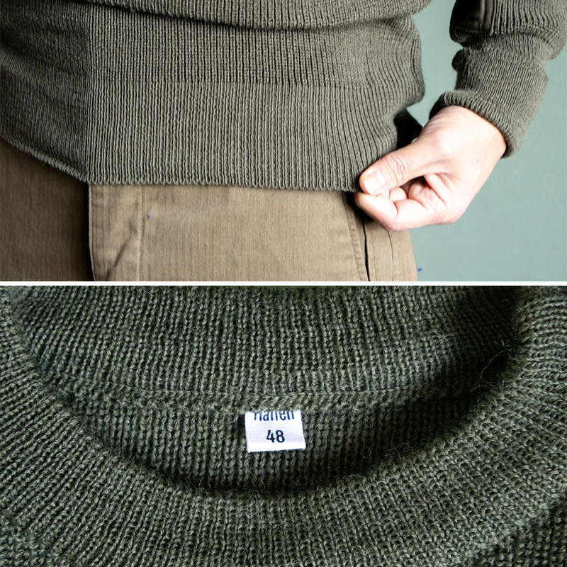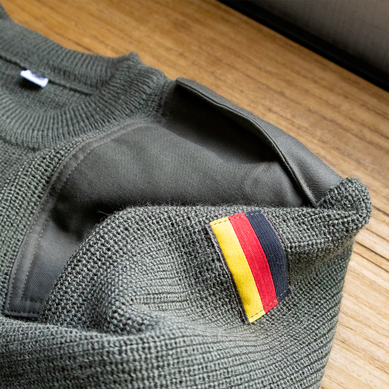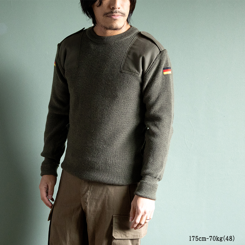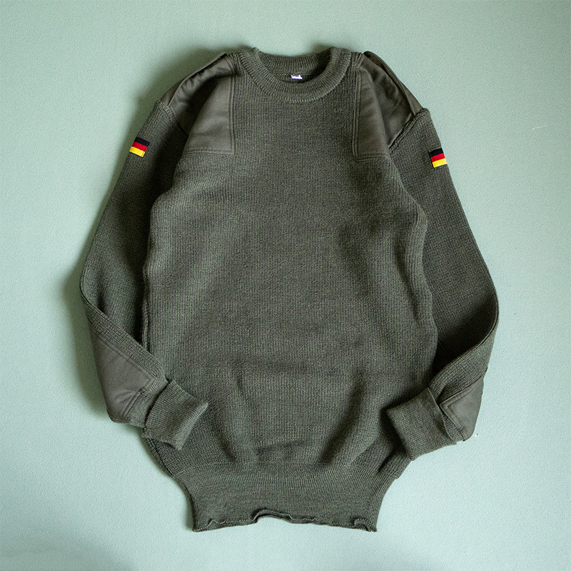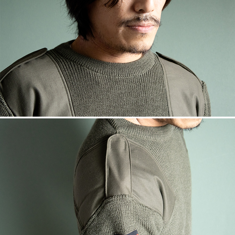無骨な雰囲気と実用性を兼ね備えた、ミリタリースタイルのクルーネットセーター。
