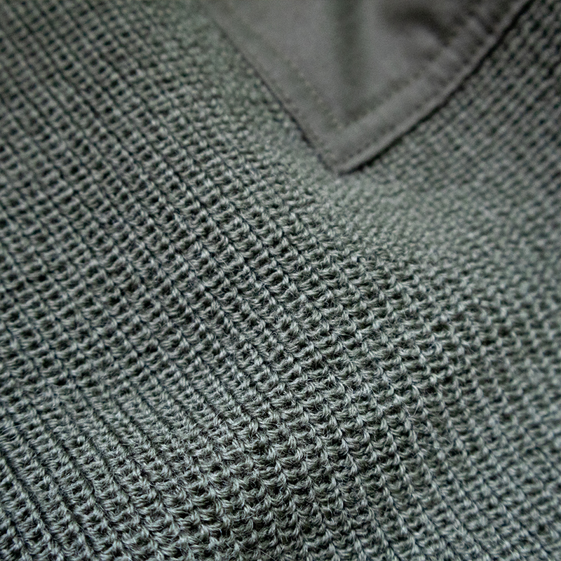 深いオリーブカラーのウールニットをベースに、肩と肘には耐久性を高めるナイロンパッチを配置。