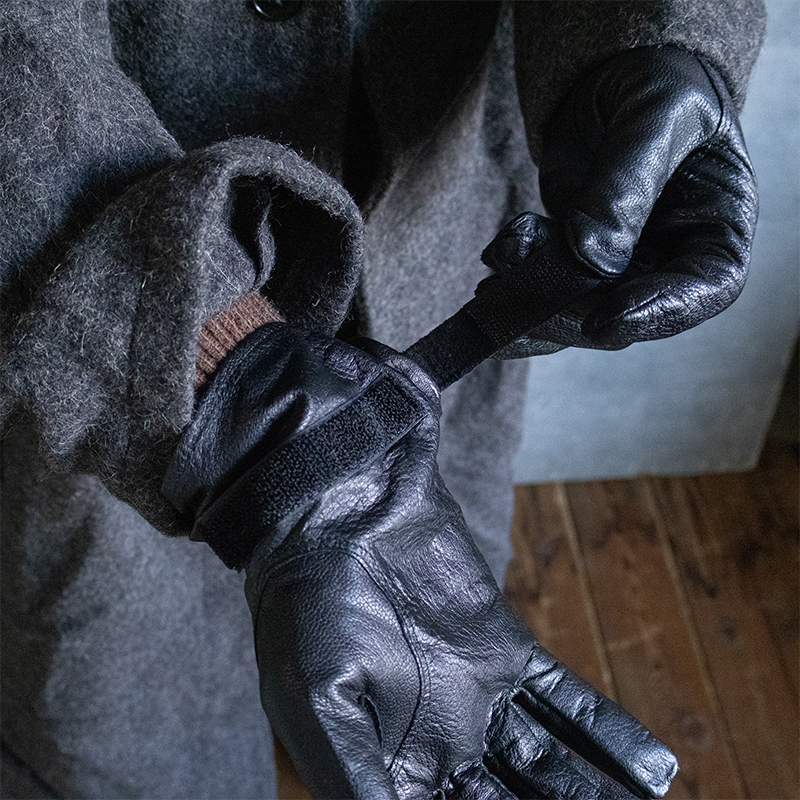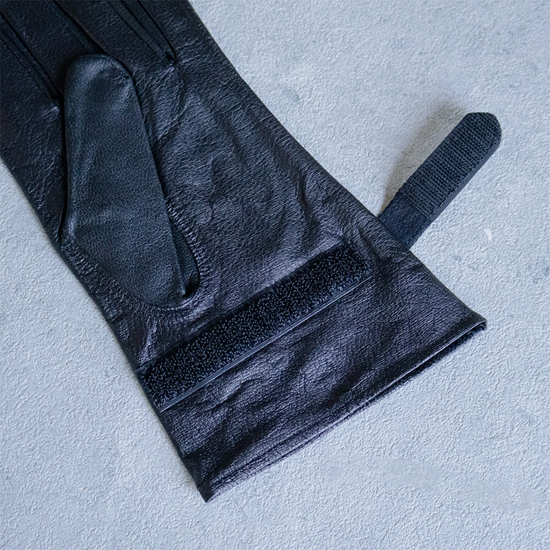 上質なレザーが使用された程良い厚みのグローブです。手首はベルクロによりサイズが調整ができます。