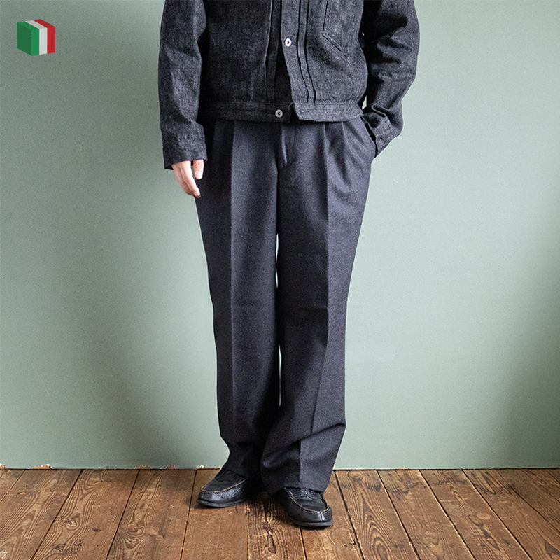 やや光沢のある厚手のウール素材を使用したスラックス。