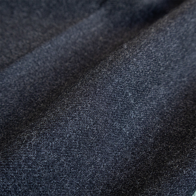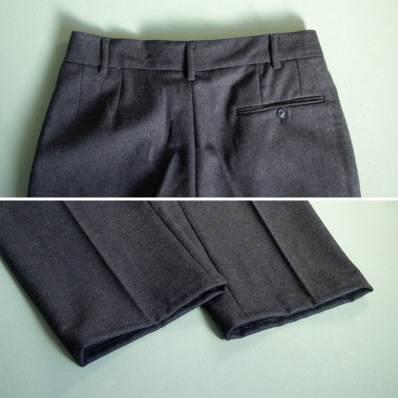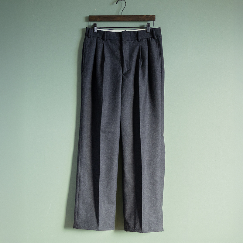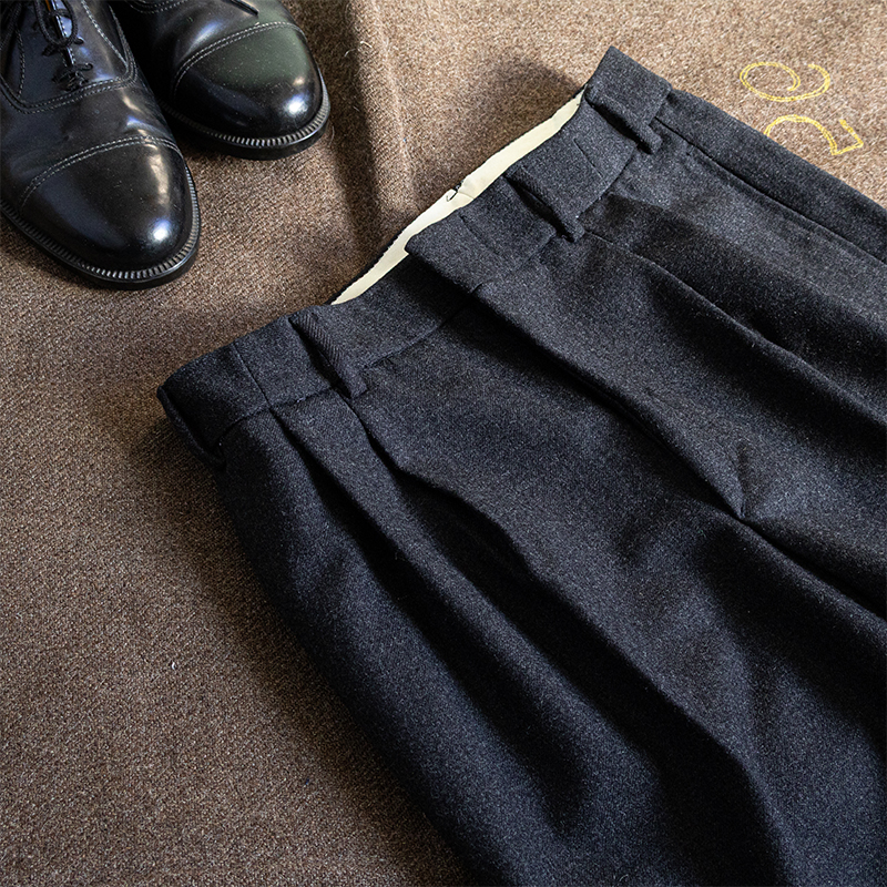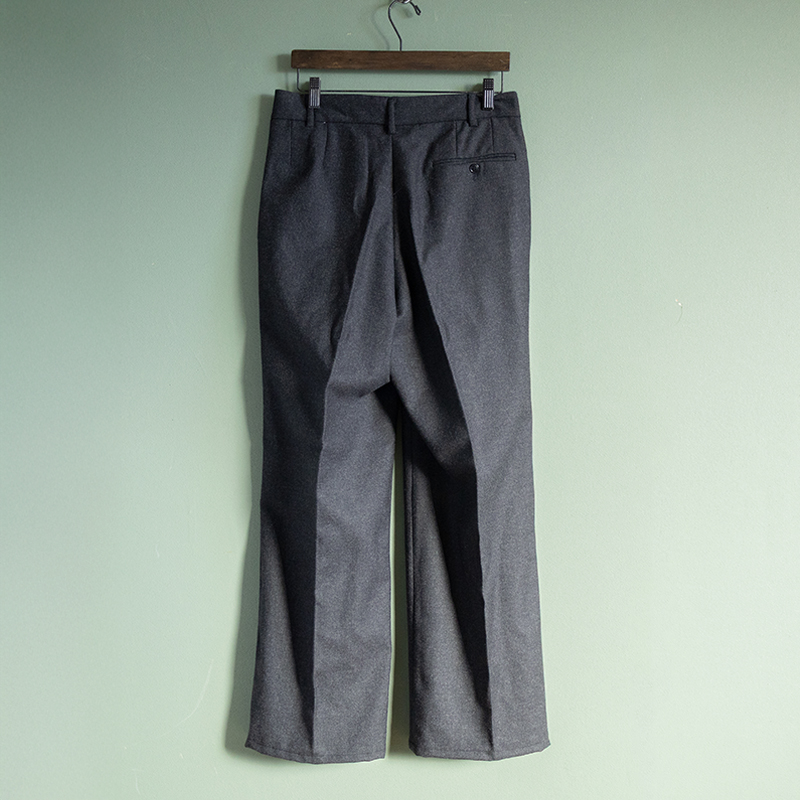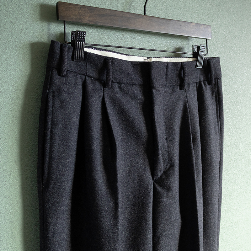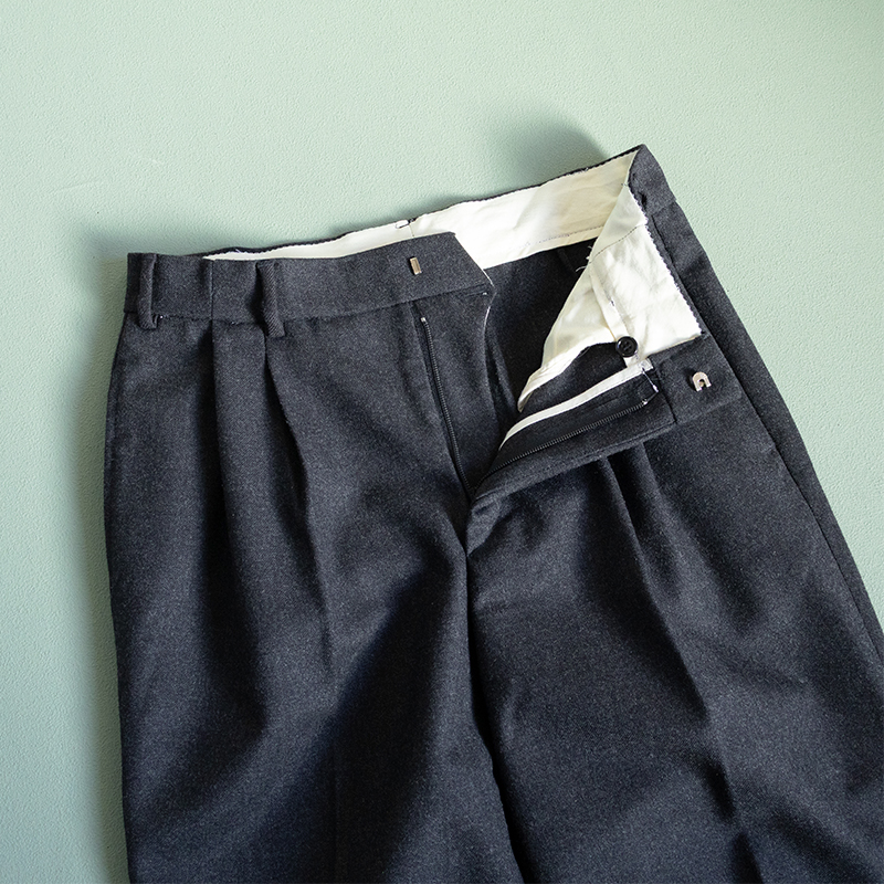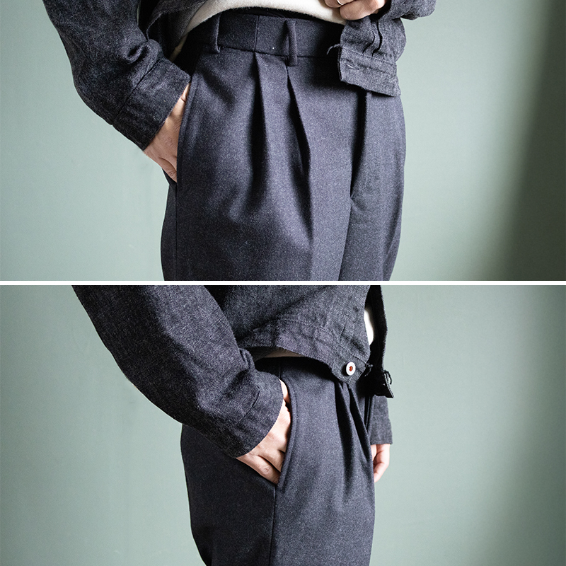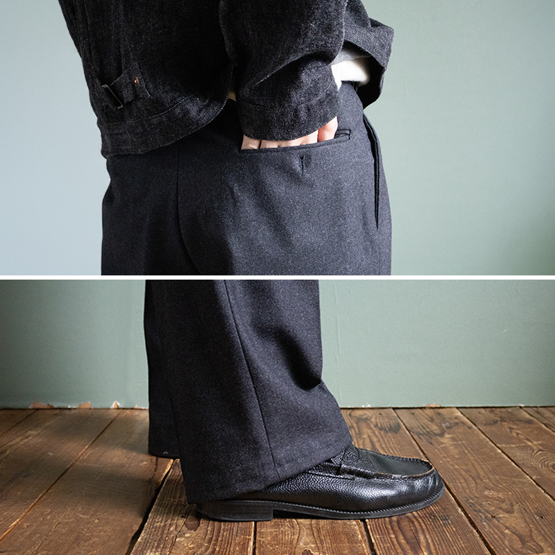 濃いグレーの色味と艶っぽい生地感も相まって、雰囲気のあるパンツです。
