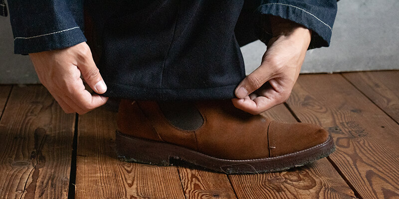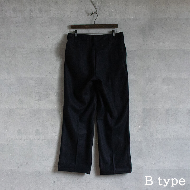 生地は柔らかでなめらかな手触りのウール製。左右の腰ポケットがあります。弊社で裾上げを行うことで、さらに履きやすい仕様となっております。