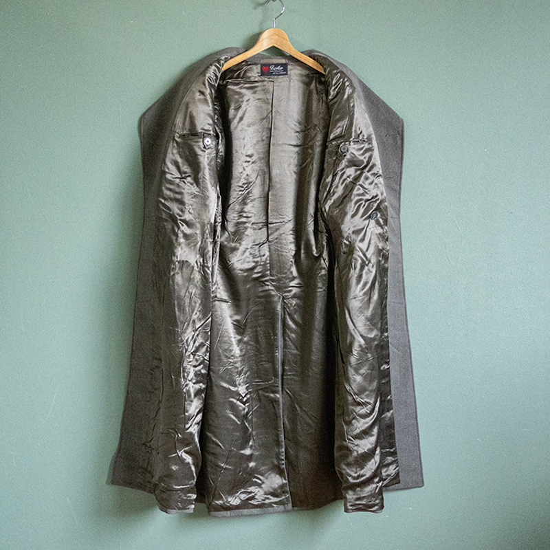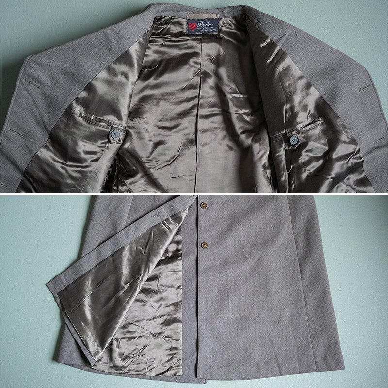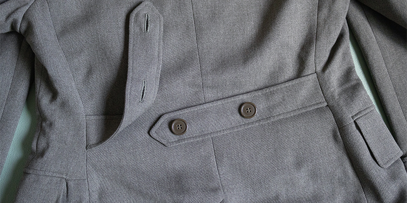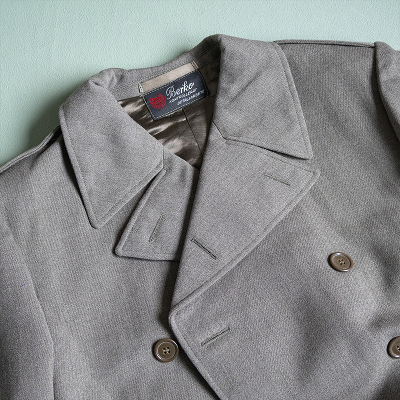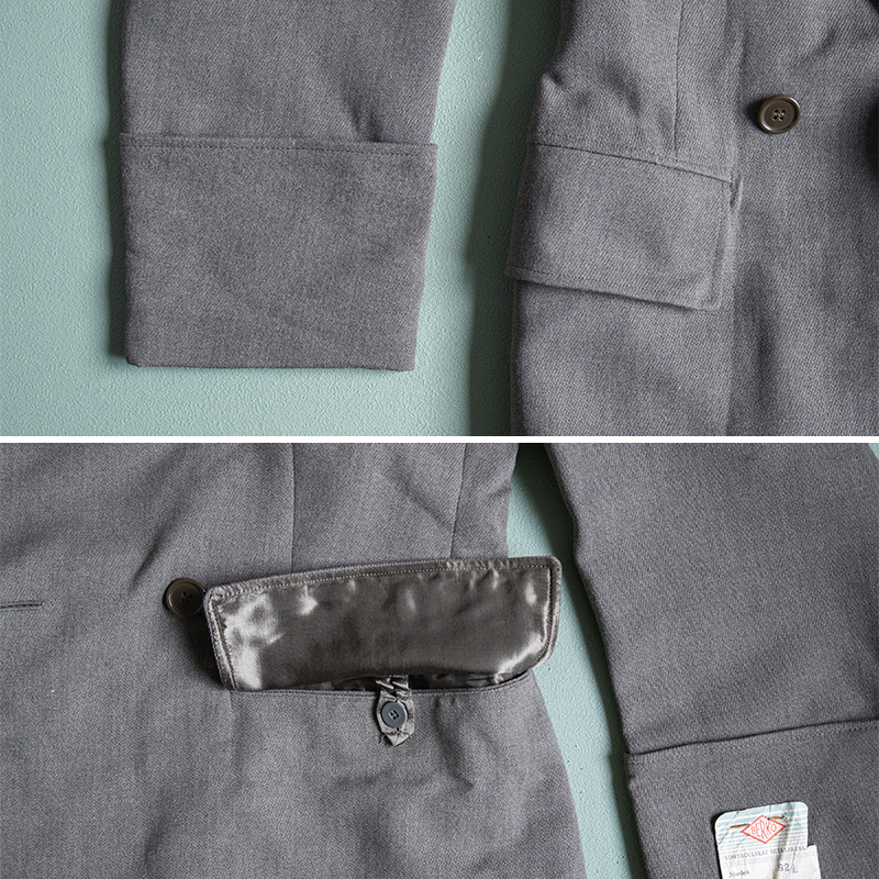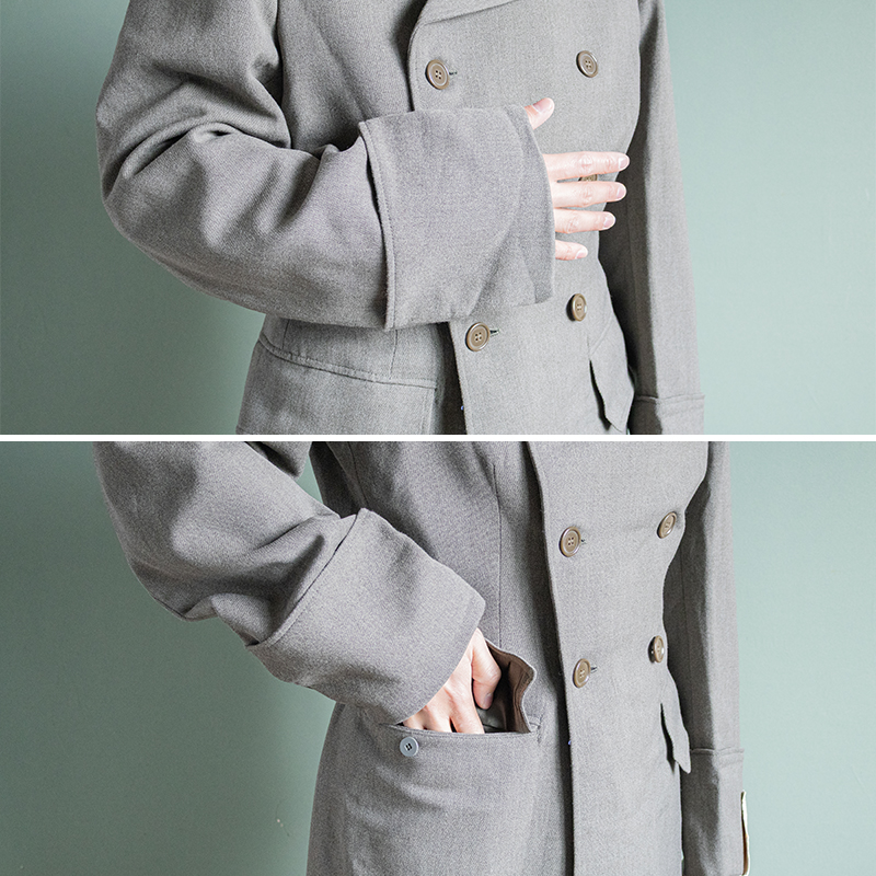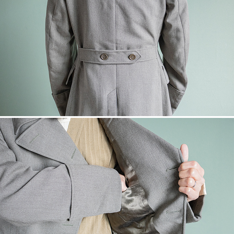 折ダブルブレストの前立て、広めのラペル、折り返しカフス等のデザインが雰囲気を醸します。