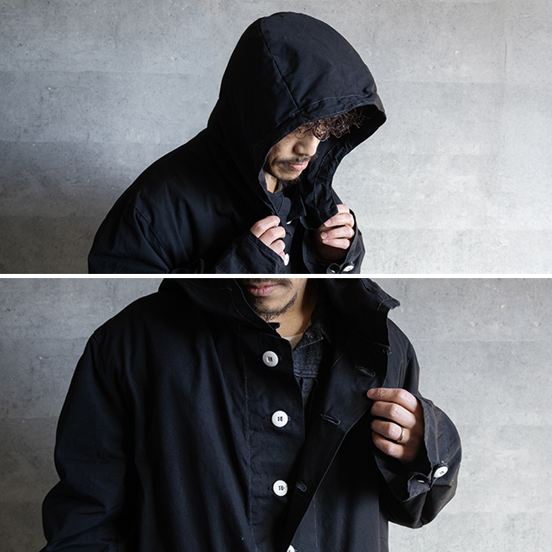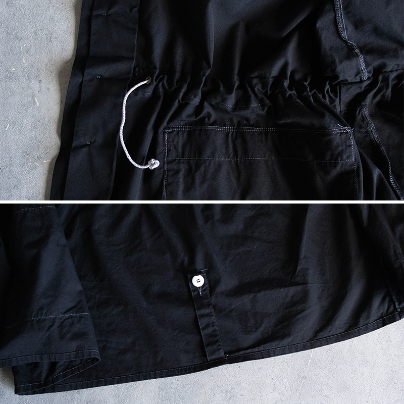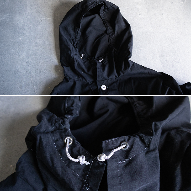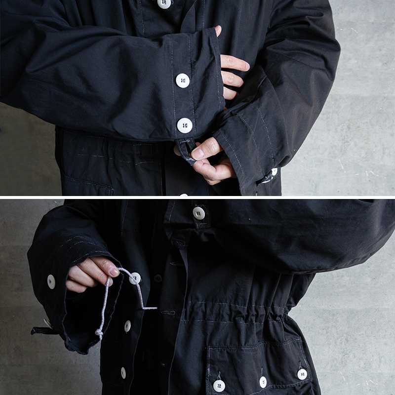 ウエストとフードはコードで、袖はボタンで、それぞれ絞ることができます。