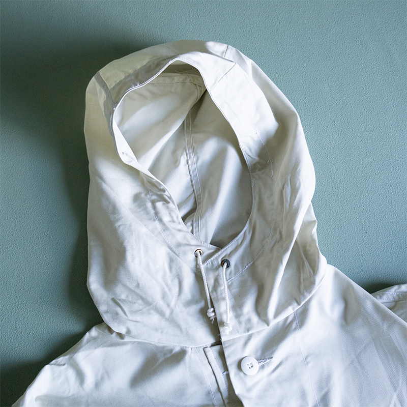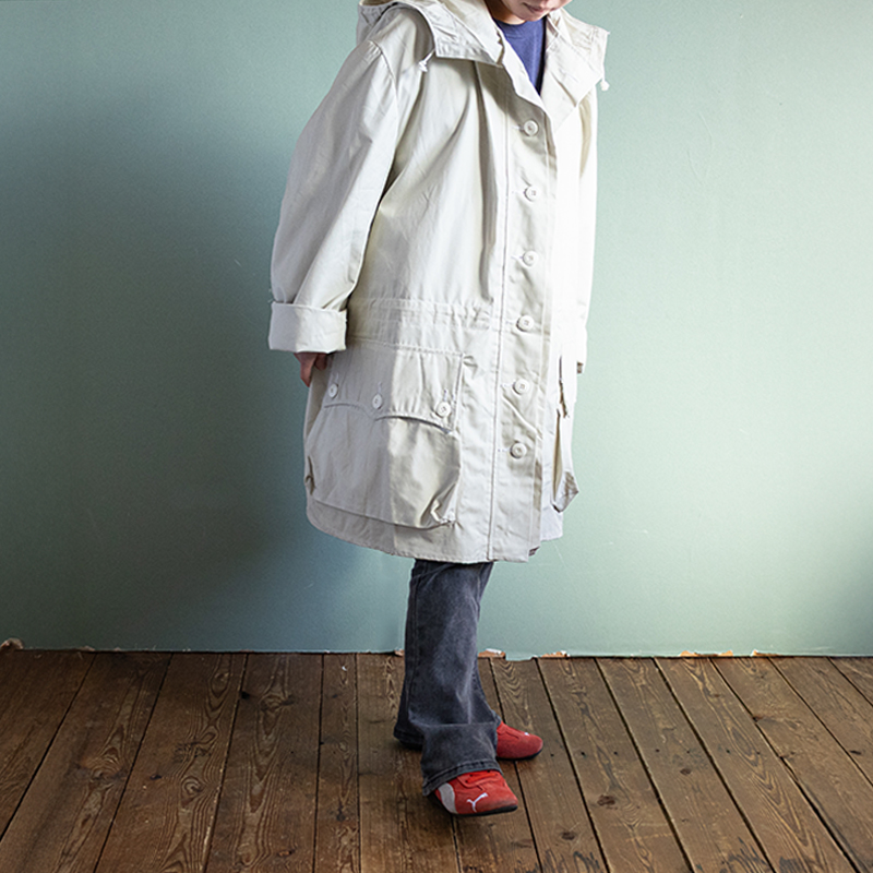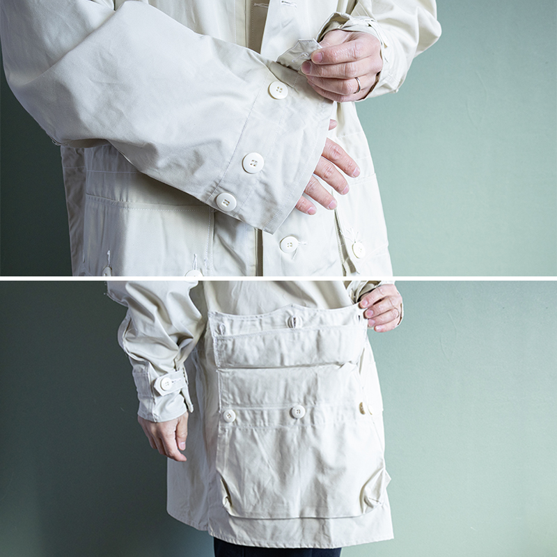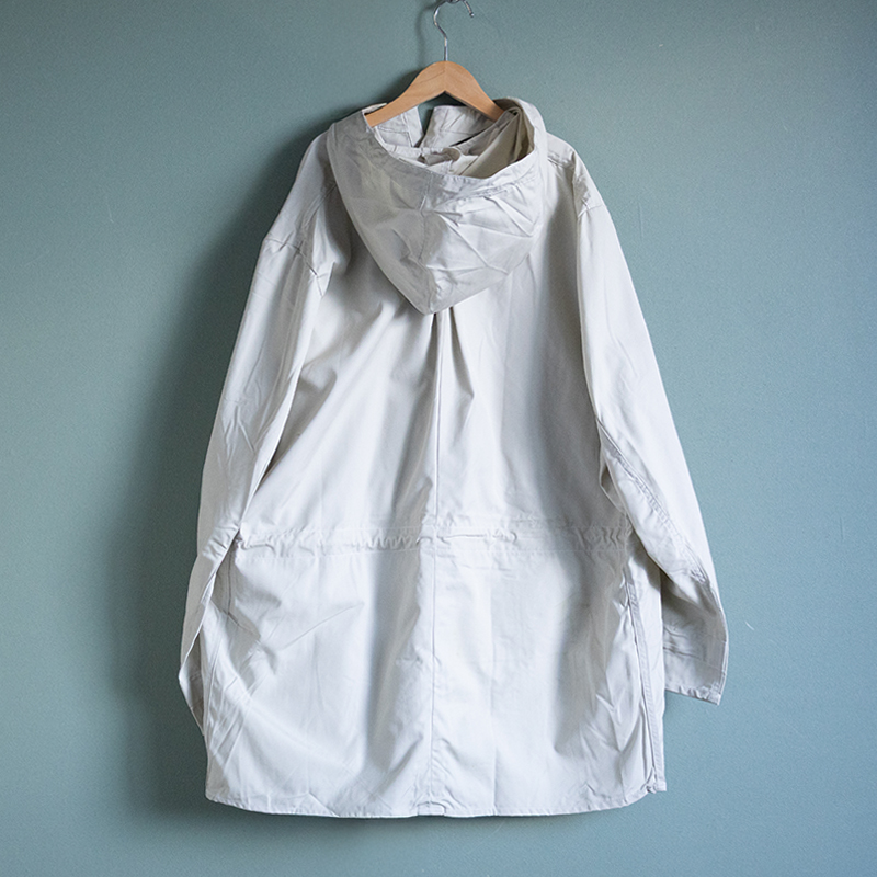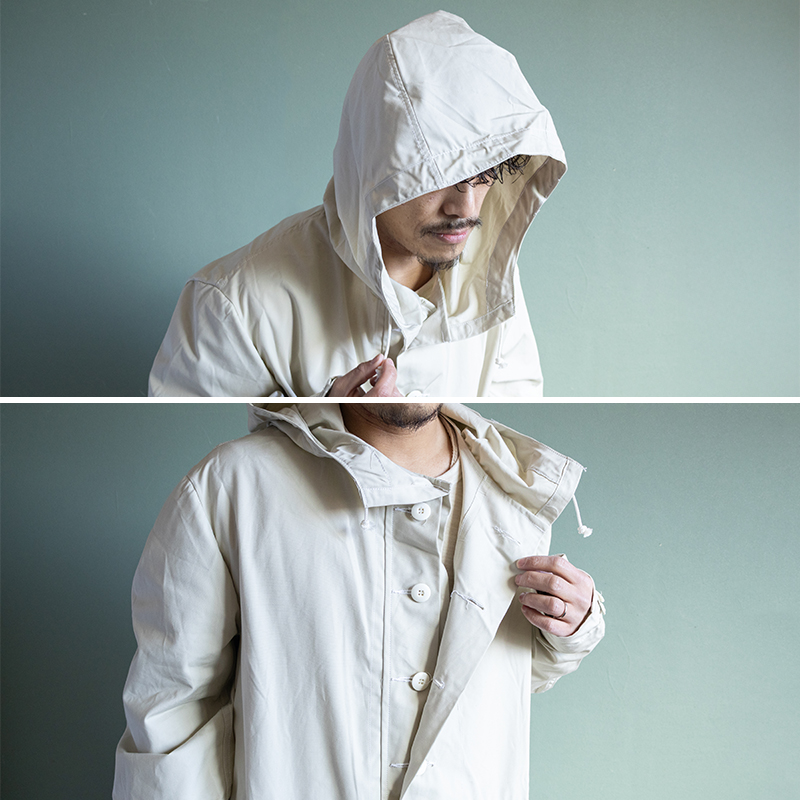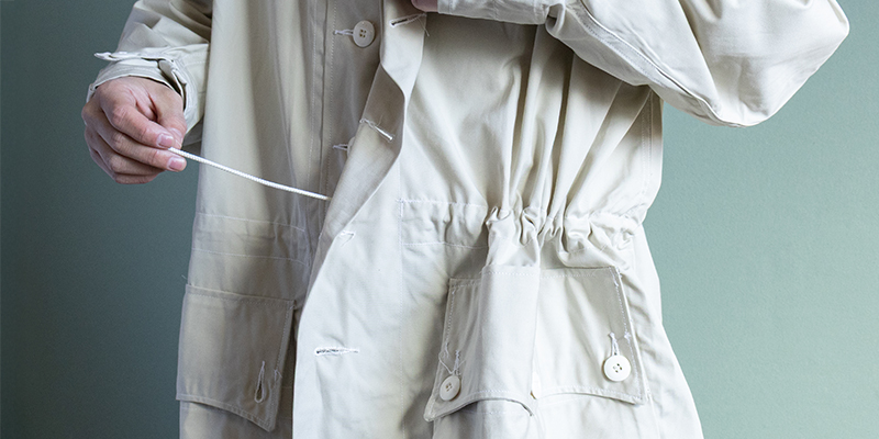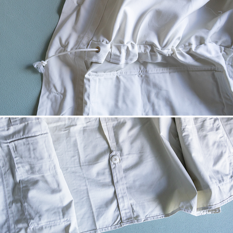 ウエストとフードはコードで、袖はボタンで、それぞれ絞ることができます。