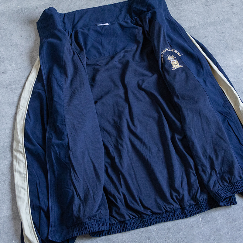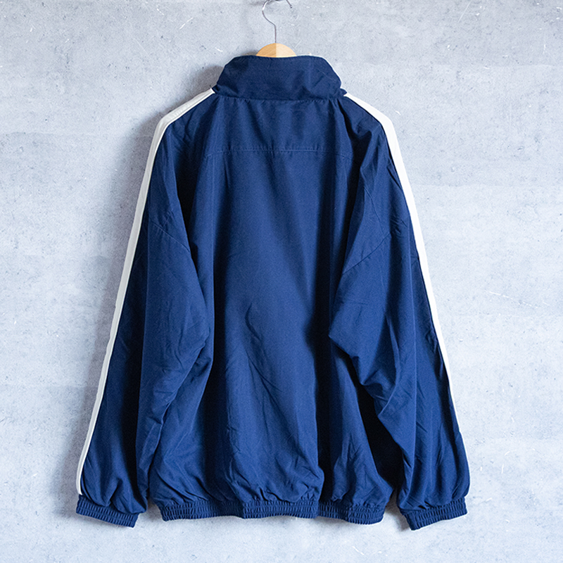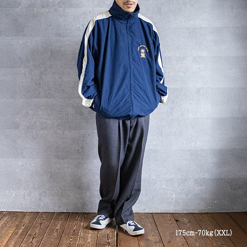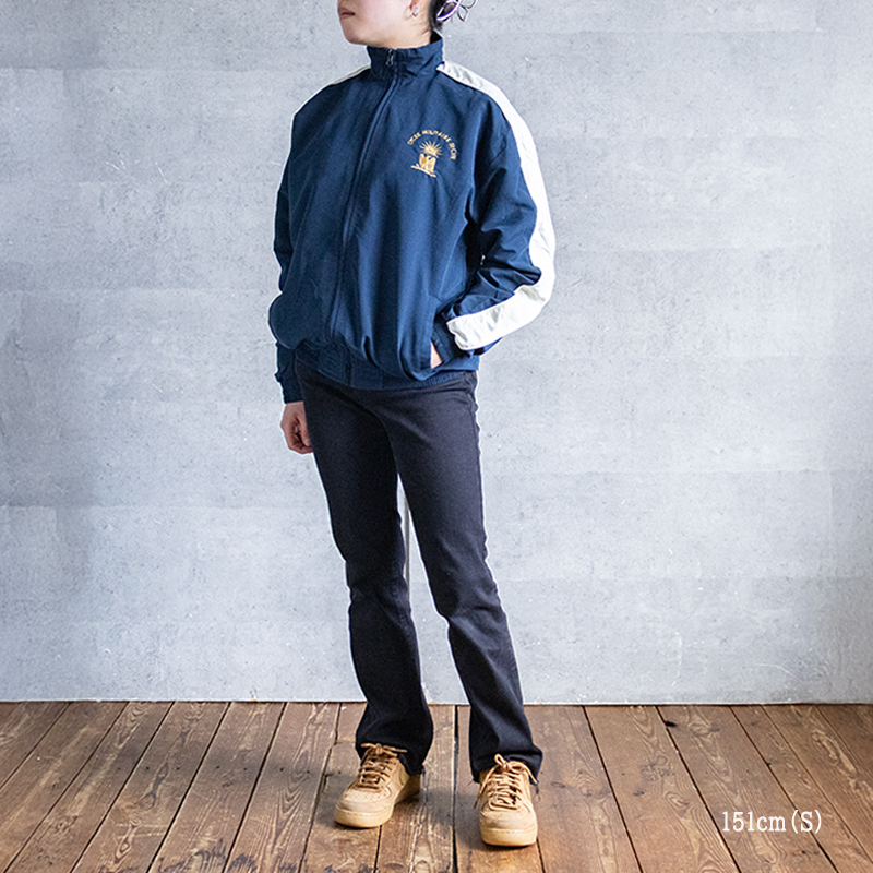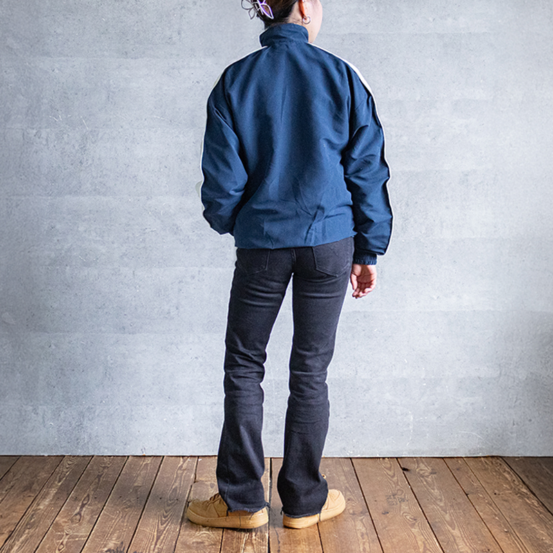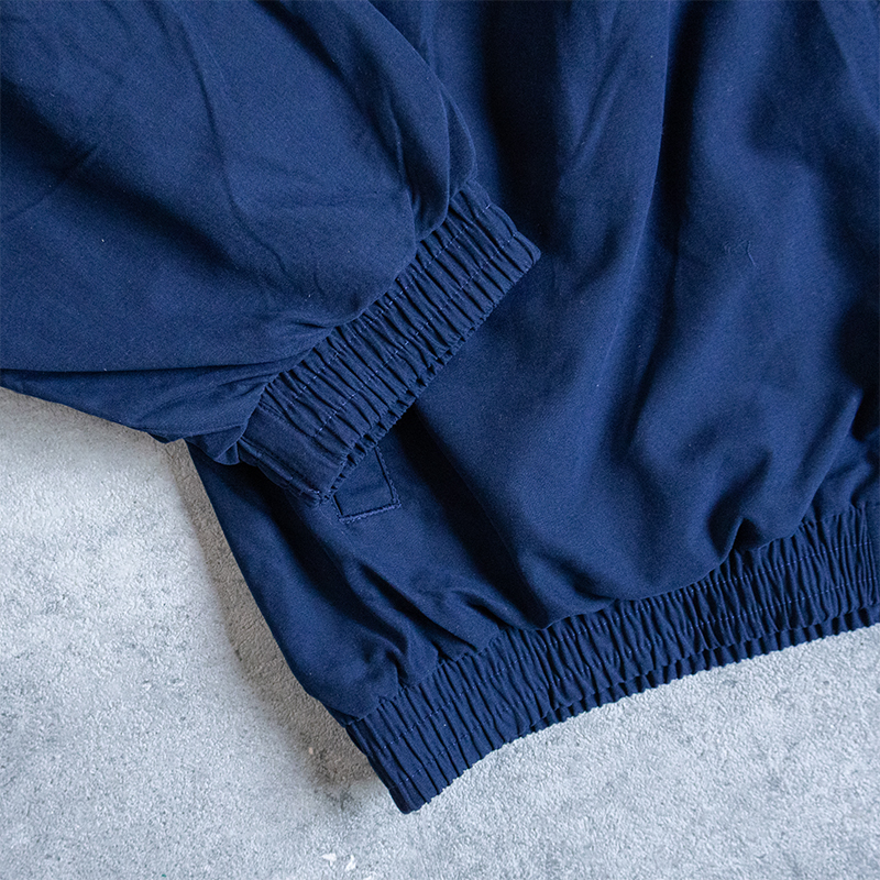 フロントはジッパー開閉、袖と裾はゴム仕様で着脱、左右にシームポケットを備えています。