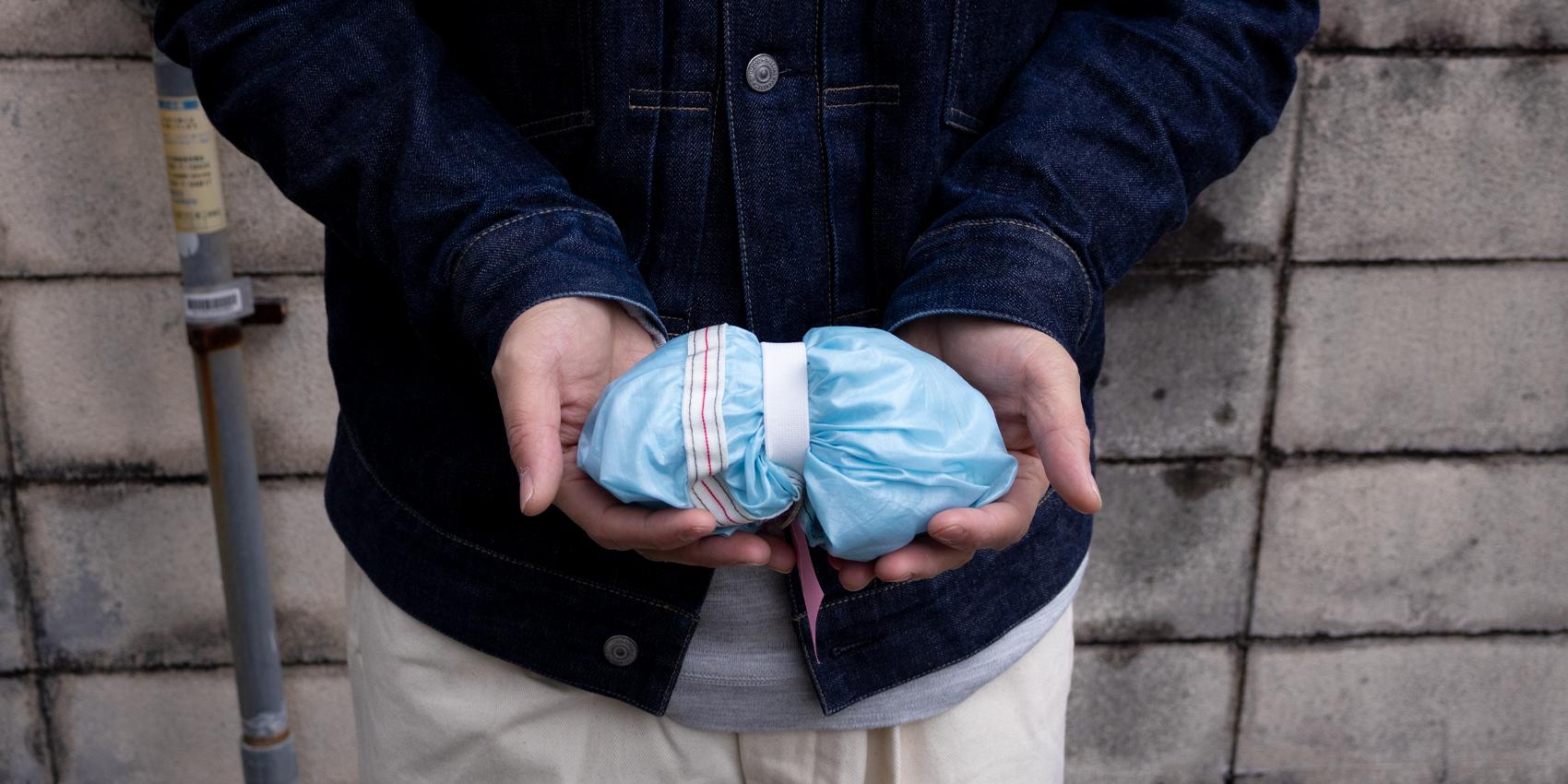 円形型生地の特徴をそのまま活かした、丸みをおびた形状。ステッチ、テープをアクセントとして残しました。