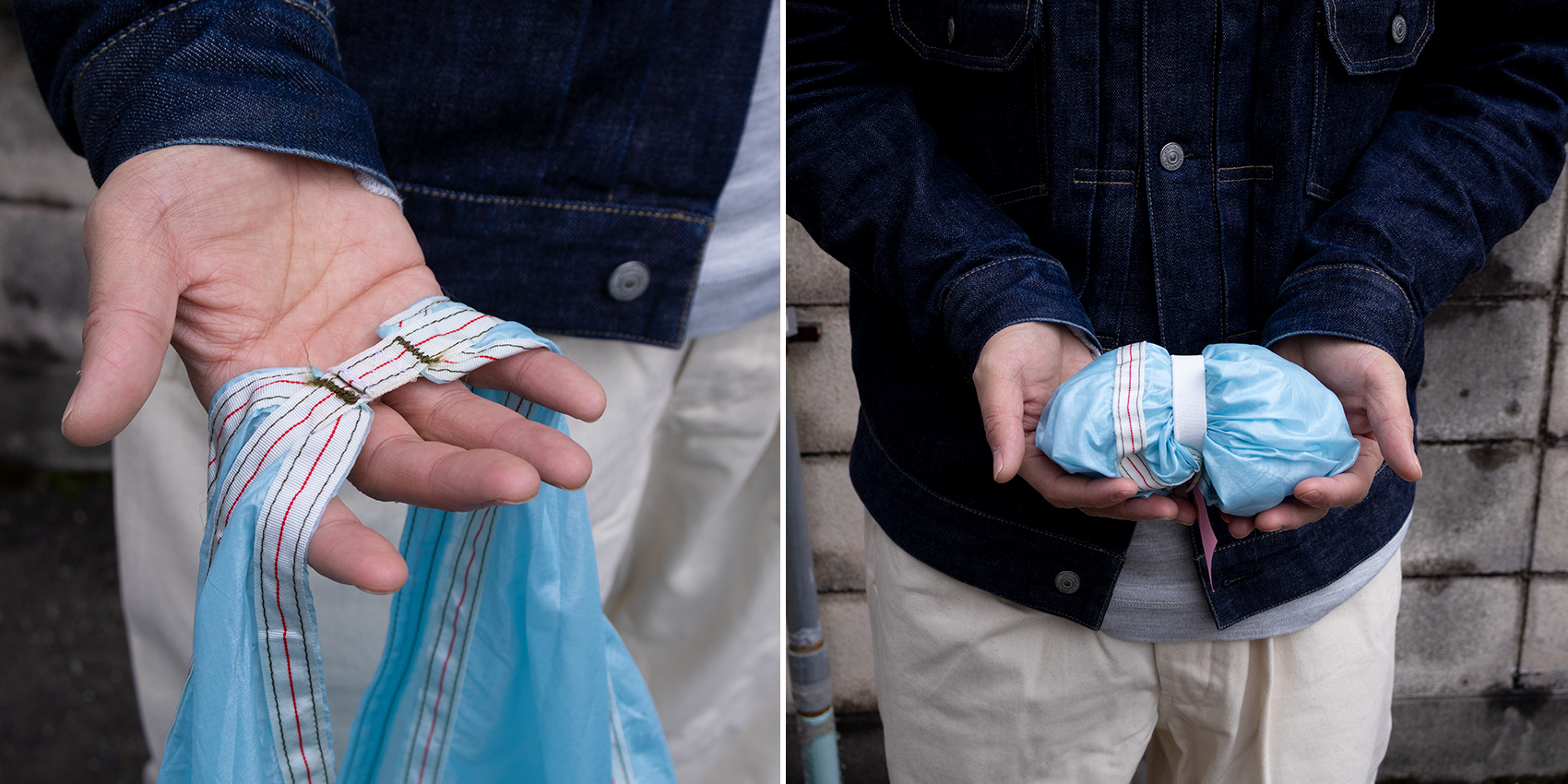 円形型生地の特徴をそのまま活かした、丸みをおびた形状。ステッチ、テープをアクセントとして残しました。