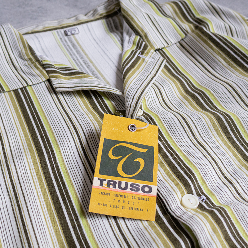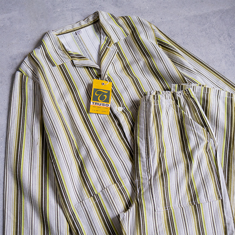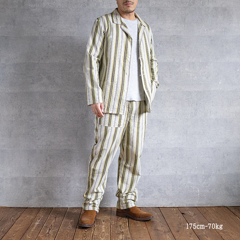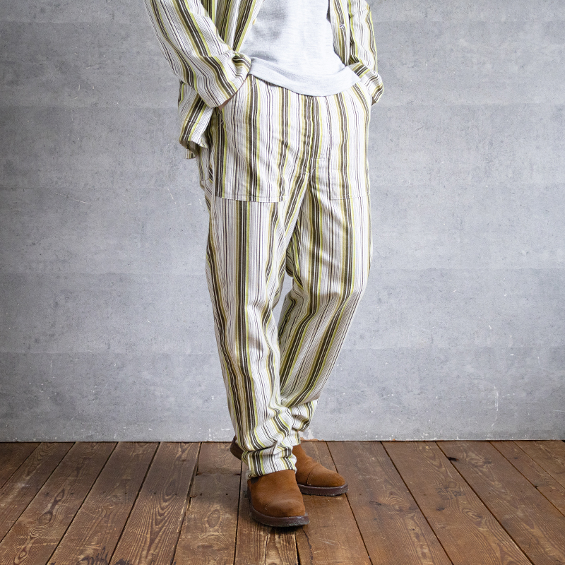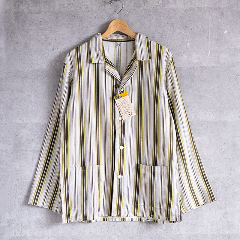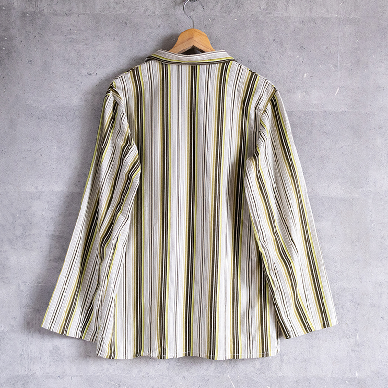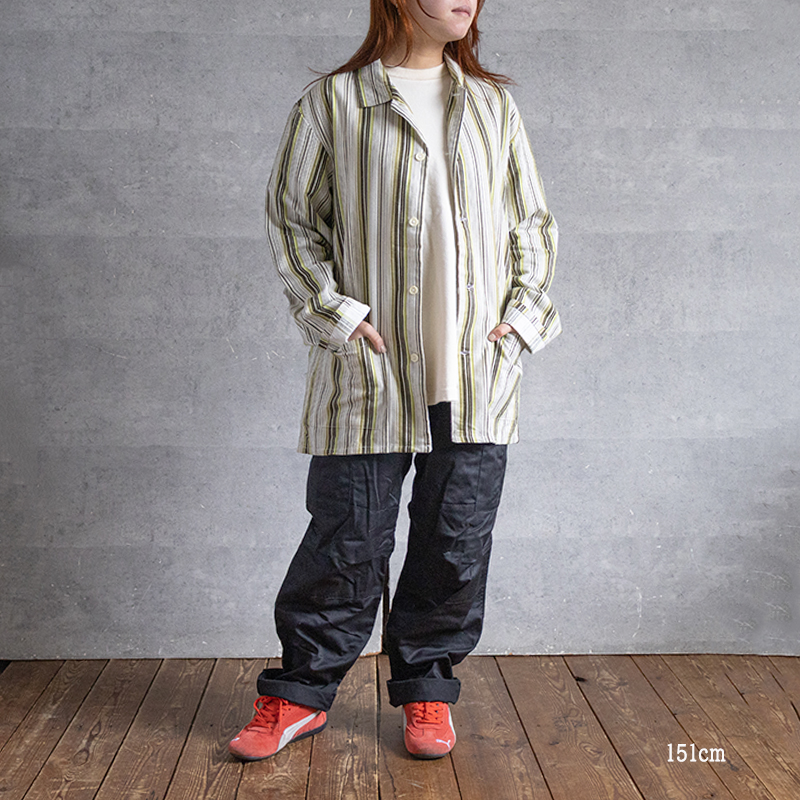 グリーンベースのストライプ柄で、ややルーズなシルエット。