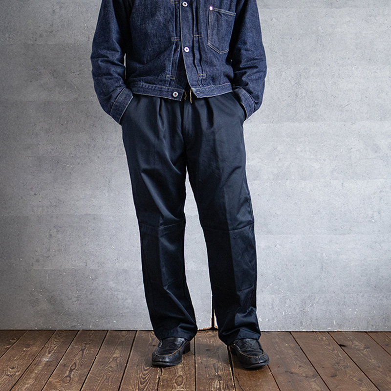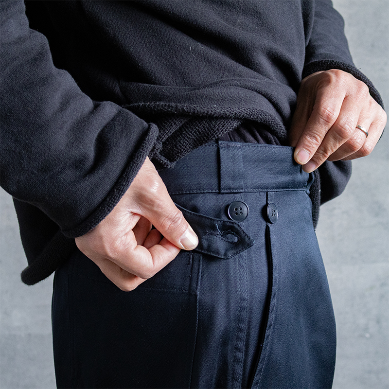 特徴でもあるウエストのアジャスターボタンに加え、ワークパンツらしさのあるダブルニー仕様でありながら、