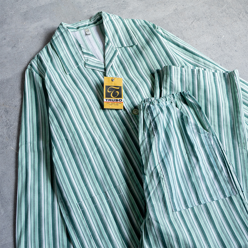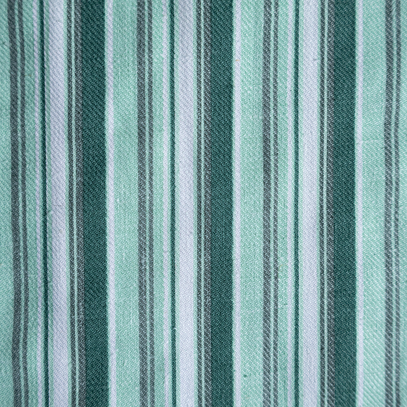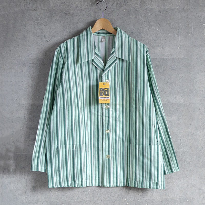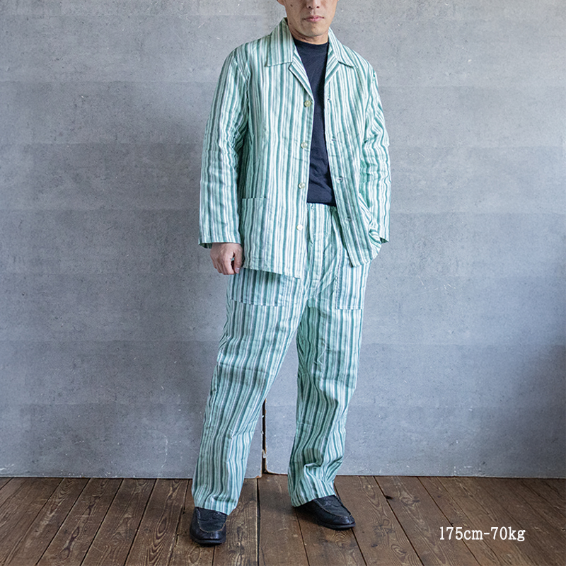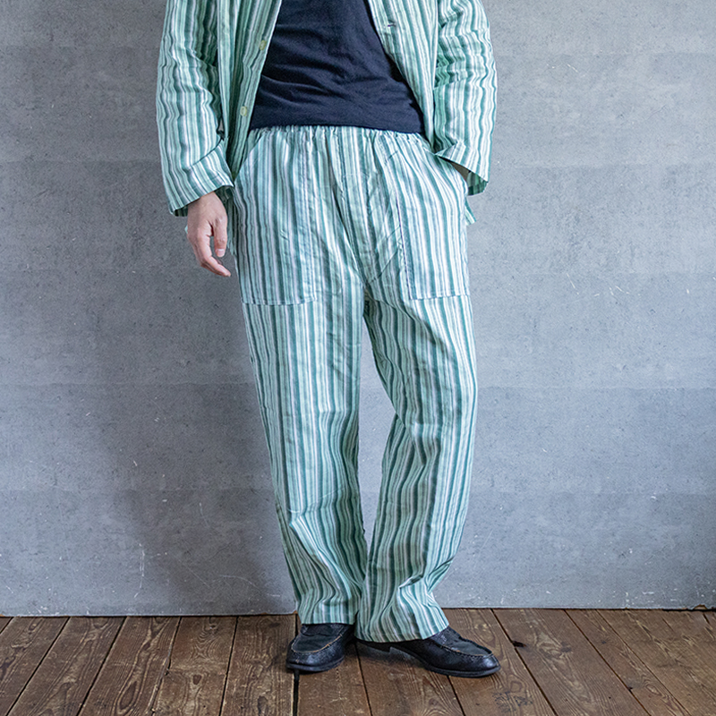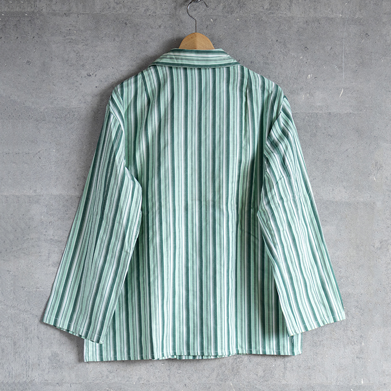 グリーンベースのストライプ柄で、ややルーズなシルエット。