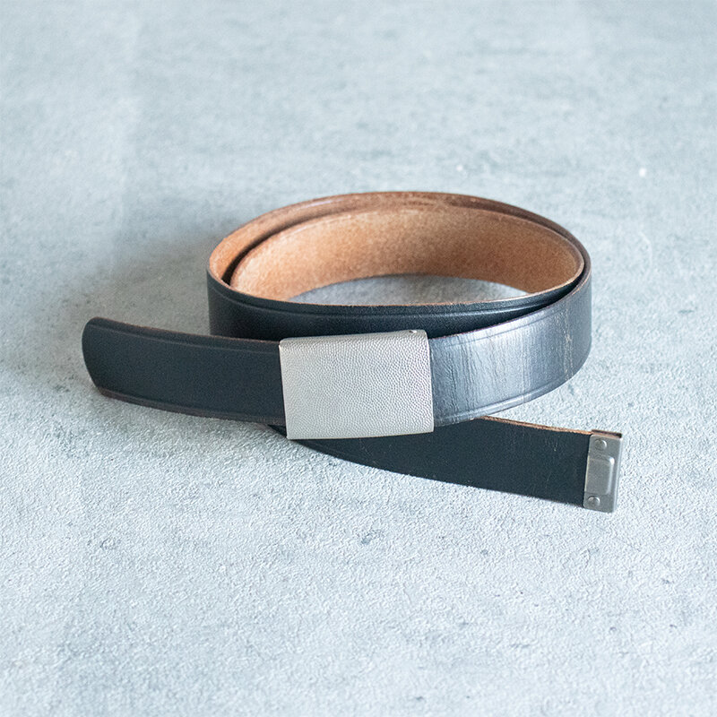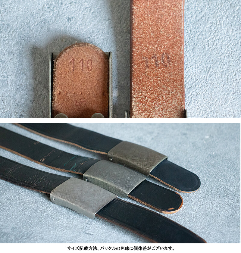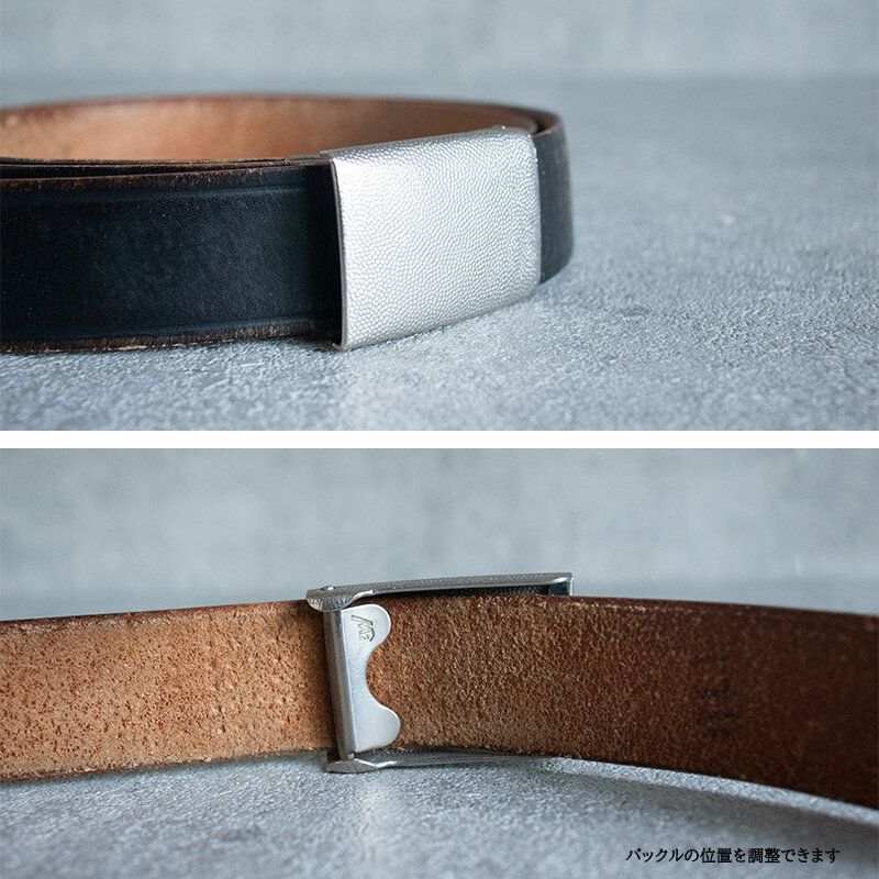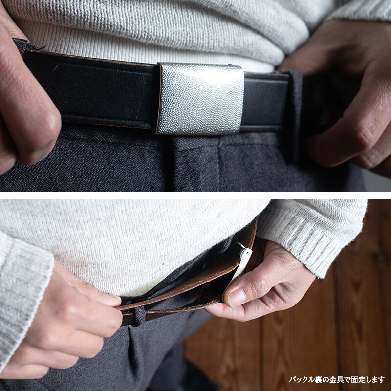バックルの内側にあるツメにベルト先の金具に引っ掛けて留める仕様です。