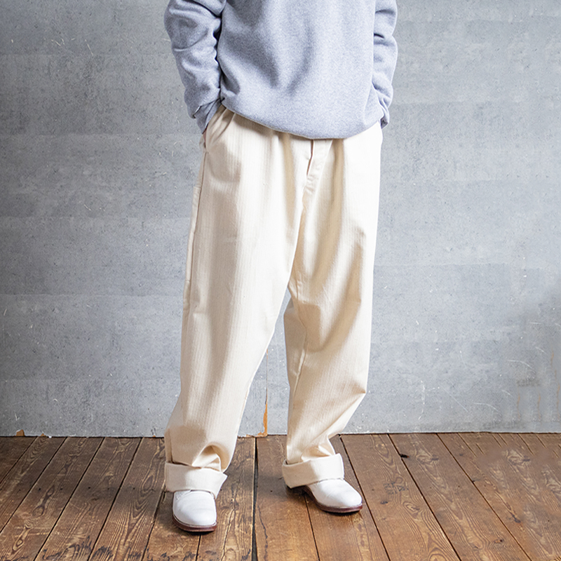 綾織り特有の上品な光沢を持ち、適度な厚みのある生地感で、通年で活躍してくれそうなパンツです。