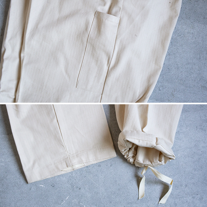 綾を交差させた生地で編まれた "ヘリンボーンツイル" で、この生地の特徴としては耐久性が高いこと、また柔軟性にも優れています。