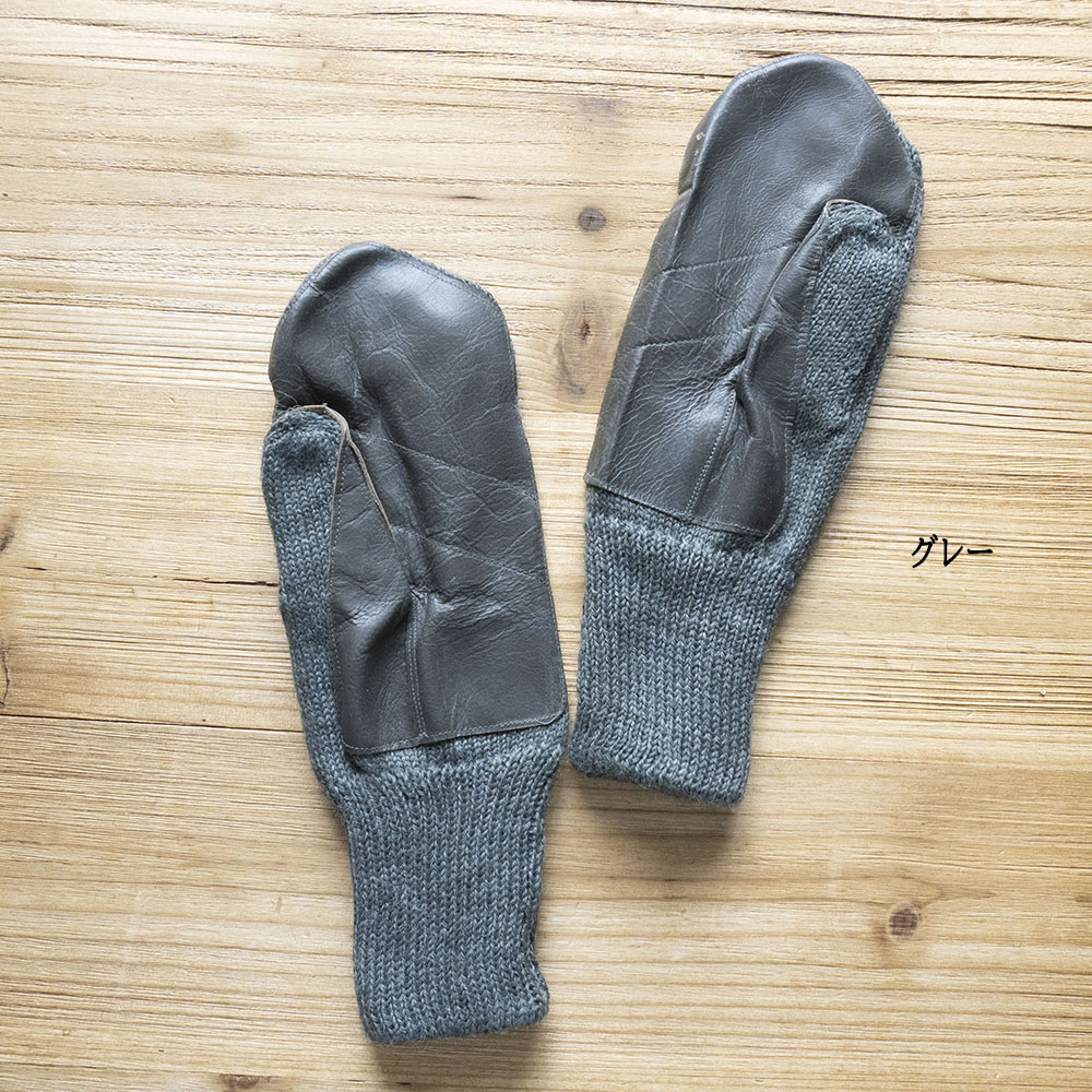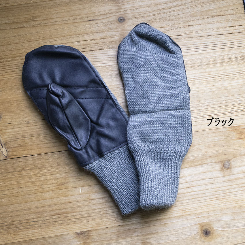 ウールで編まれたミトンで、手のひら側にはレザーが施されています。